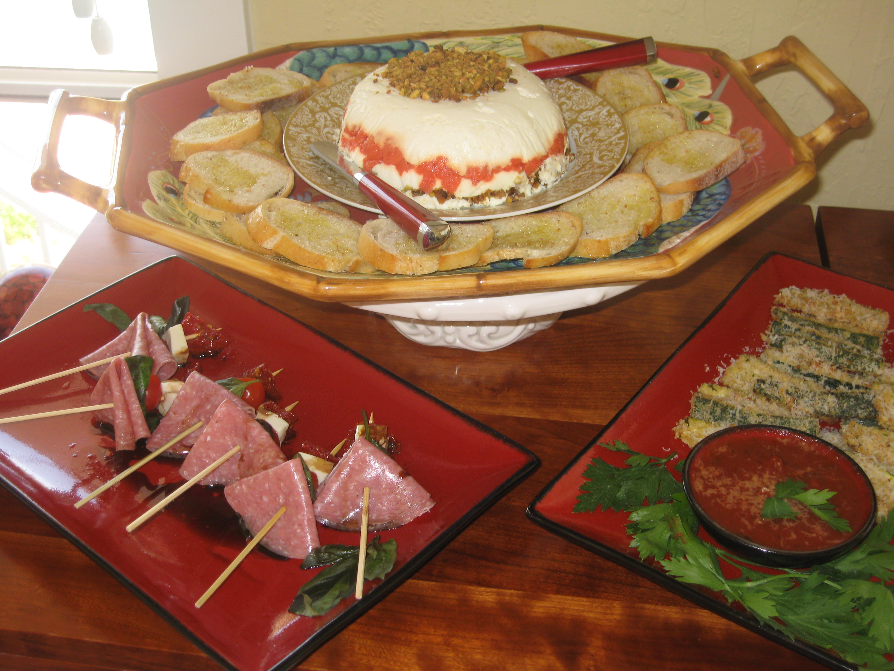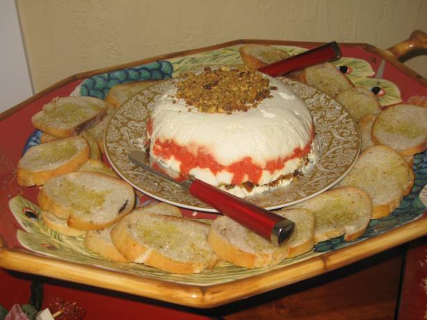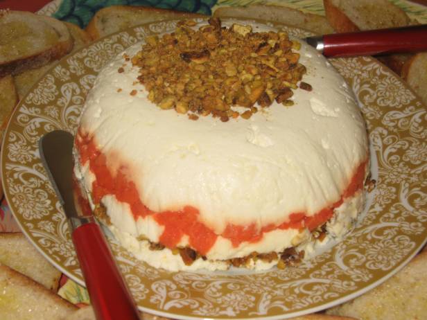 Lightly toast pistachios in fry pan a few min., coarsely chop, set aside. In bowl, combine cheeses, blend well. Line deep 3-4 in bowl with plastic wrap. Let it hang over the sides. Lightly oil the plastic. Spoon one-third cheese mix. into the bowl. Using oiled spool, pack down tightly. Spread the smoked salmon evenly over the cheese, packing it down firmly and leveling the top. Spool another layer of the cheese mixture, packing it down firmly. Sprinkle most of the pistachios evenly over the cheese, reserving some for sprinkling on top. Spoon in the remaining cheese, packing it down firmly and leveling the top. Cover with the overlapping plastic wrap and refrigerate for at least 2 hrs. or up to 24. Un-mold on to a serving dish and serve with baguette slices.
