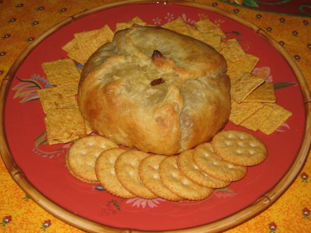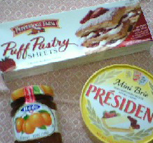 Preheat oven to 400. Lightly grease cookie sheet. Roll puff pastry out slightly. Place cheese wheel on top, leave rind on. Place guava on top of cheese, then almonds, bundle up , Bake 20-25 min. Let cool 5 min.