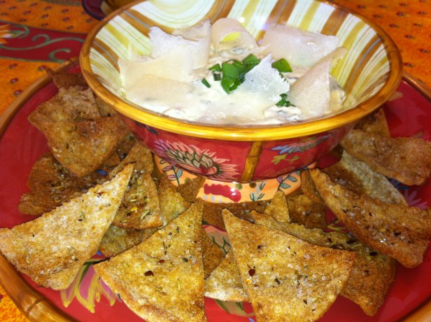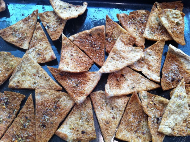 Slice pita into 8 wedges. Split in half. Brush with olive oil and sprinkle with garlic salt. Toast in oven until crisp.