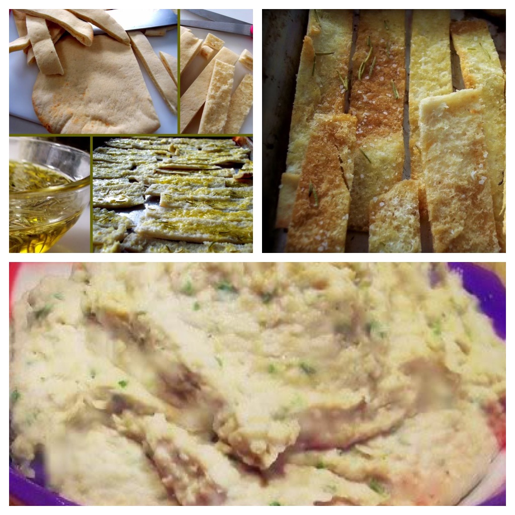 The olive oil & rosemary pita chips can be made in advance and stored between sheets of wax paper in an air tight container! They can be addictive! So make plenty. Keep an eye on them while baking, they can burn fast!