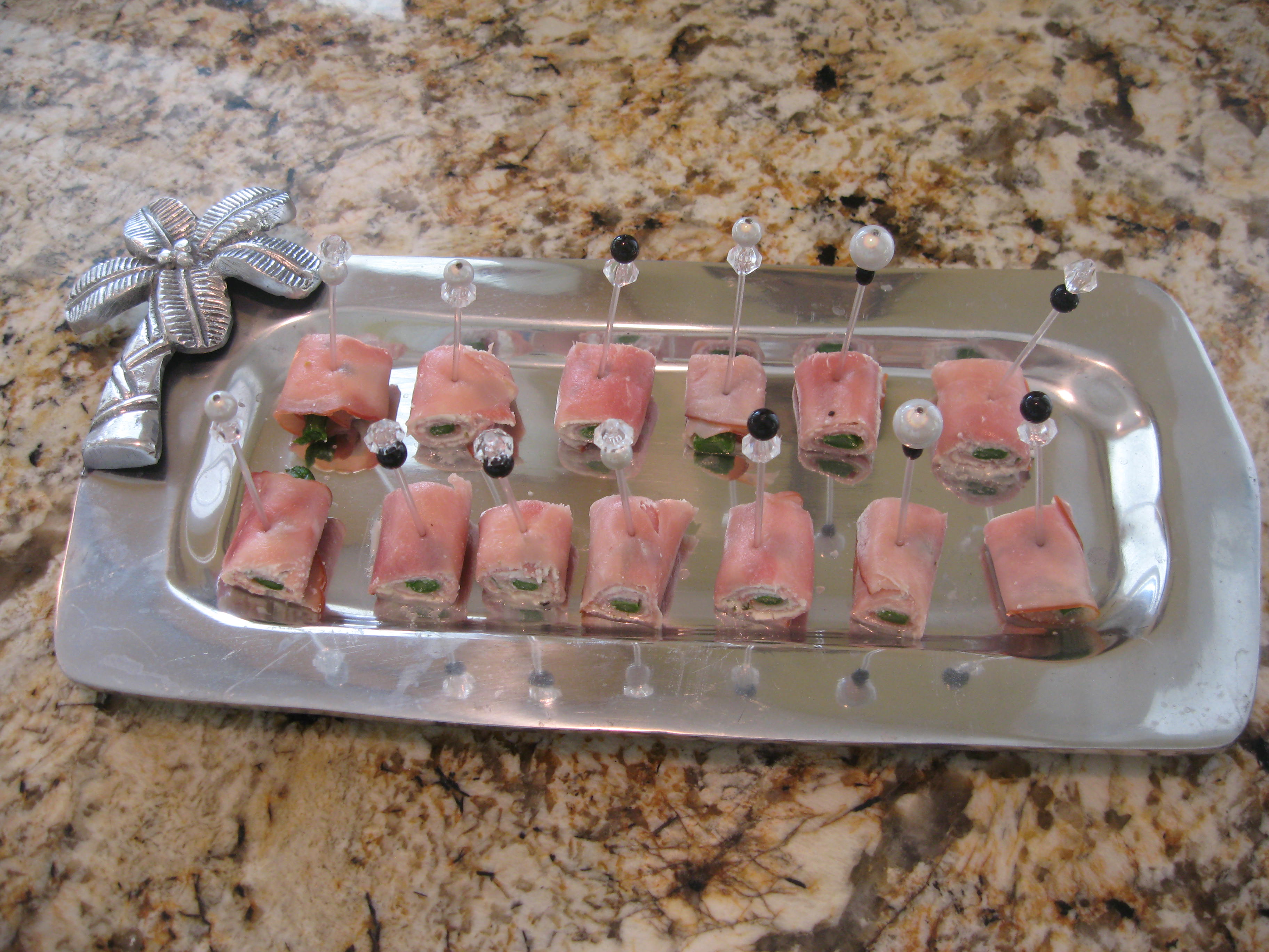 Blanch asparagus in boiling water for 2 minutes, dip in ice water to stop cooking. Drain on paper towels. Take slice of ham and spread cream cheese mixture on face. Place asparagus at one end and roll up. Cut into 1 1/2 inch slices. Serve cold with decorative toothpicks.