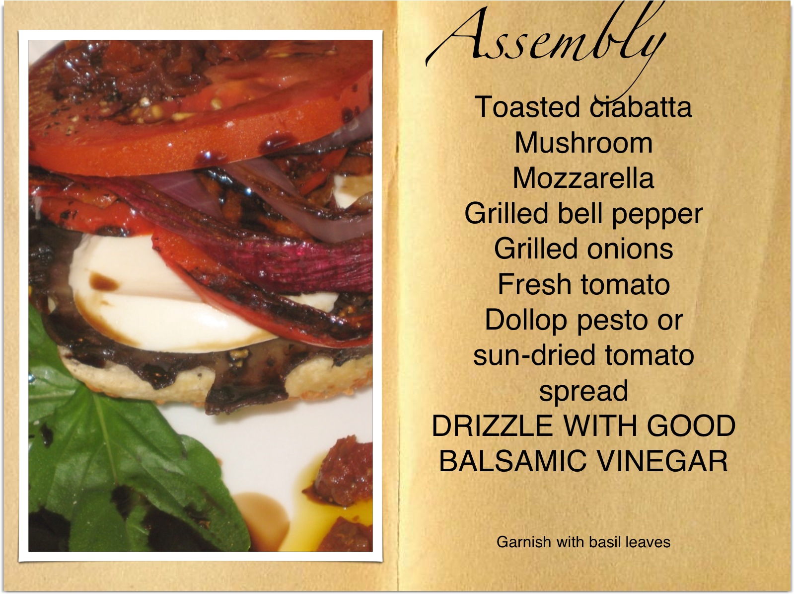 Clean the stem and gills on the mushroom. Cut red pepper & onion in rings. Toss all three with olive oil, salt & pepper. Grill until tender. Toast ciabatta bun, see order of assembly below. Basil for garnish. (1 sandwich)