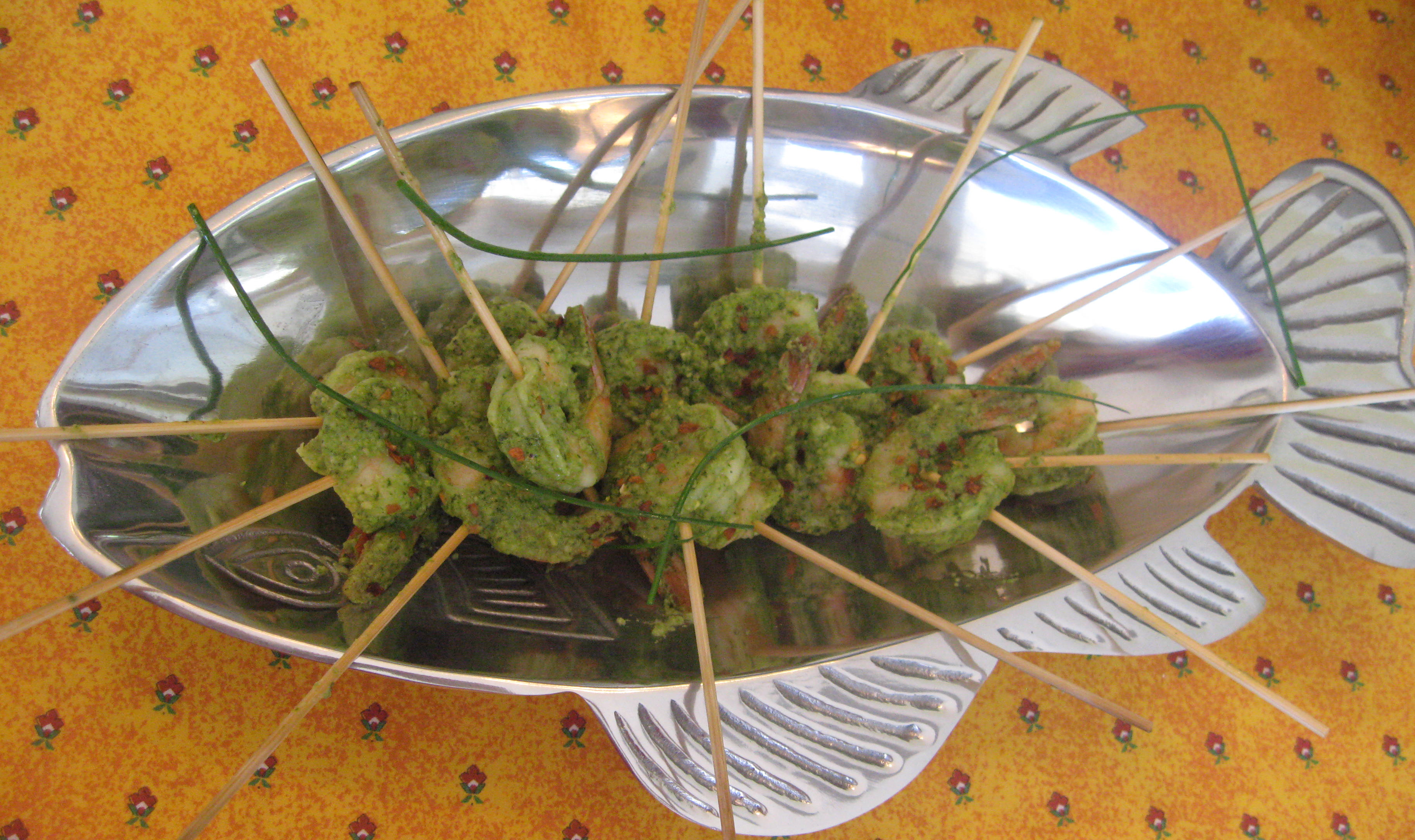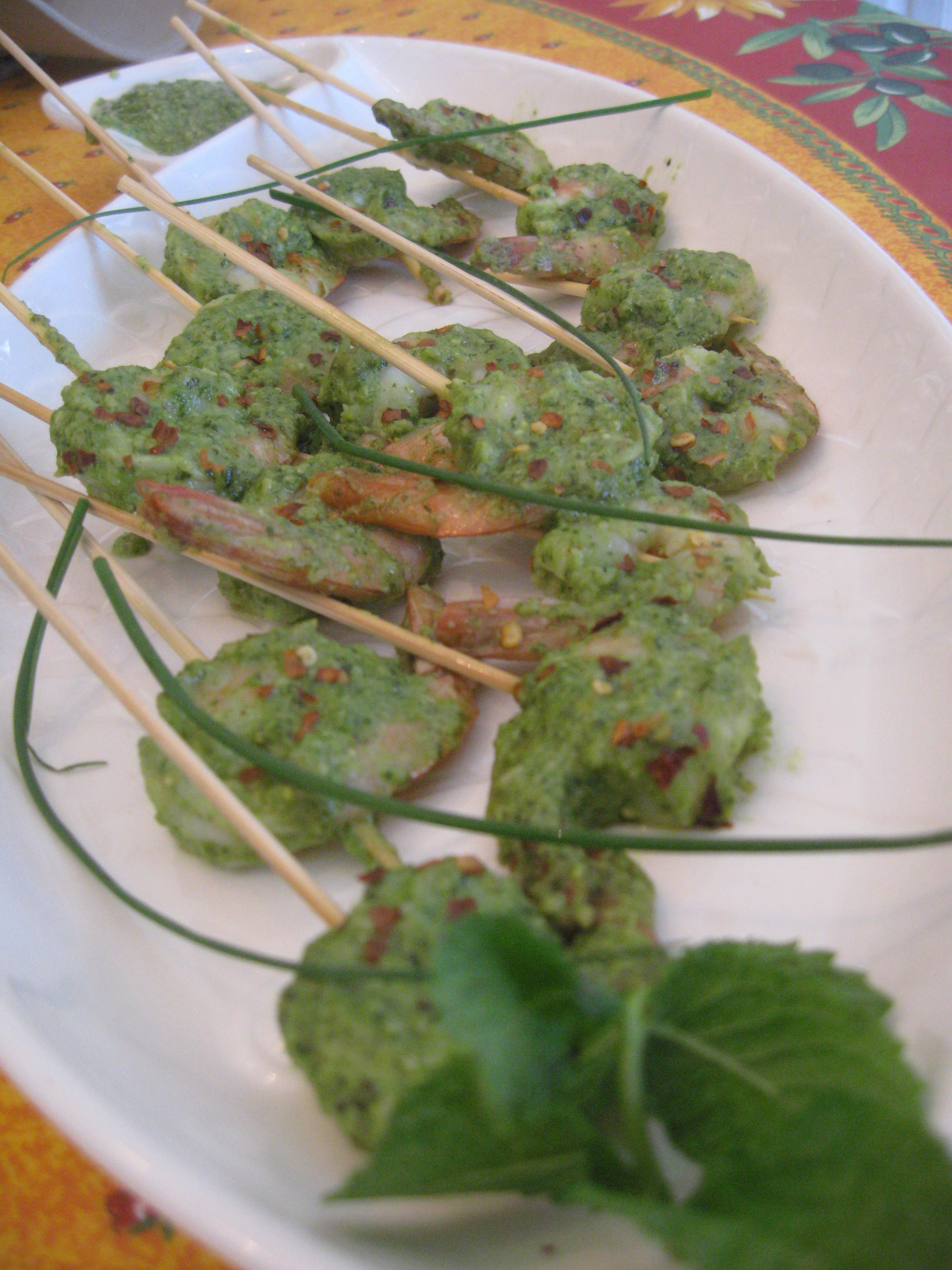 Preheat oven to 400. Soak small wooden skewers in water for 10 min, drain. Dip shrimp in pesto to coat. Put each one on a skewer. Arrange skewers on baking sheet in single layer. Sprinkle with red pepper flakes. Bake 8-10 min. Garnish with chives. Serve immediately. (I like the tails off since it is easier to eat at a party, no tails to get rid of!)
