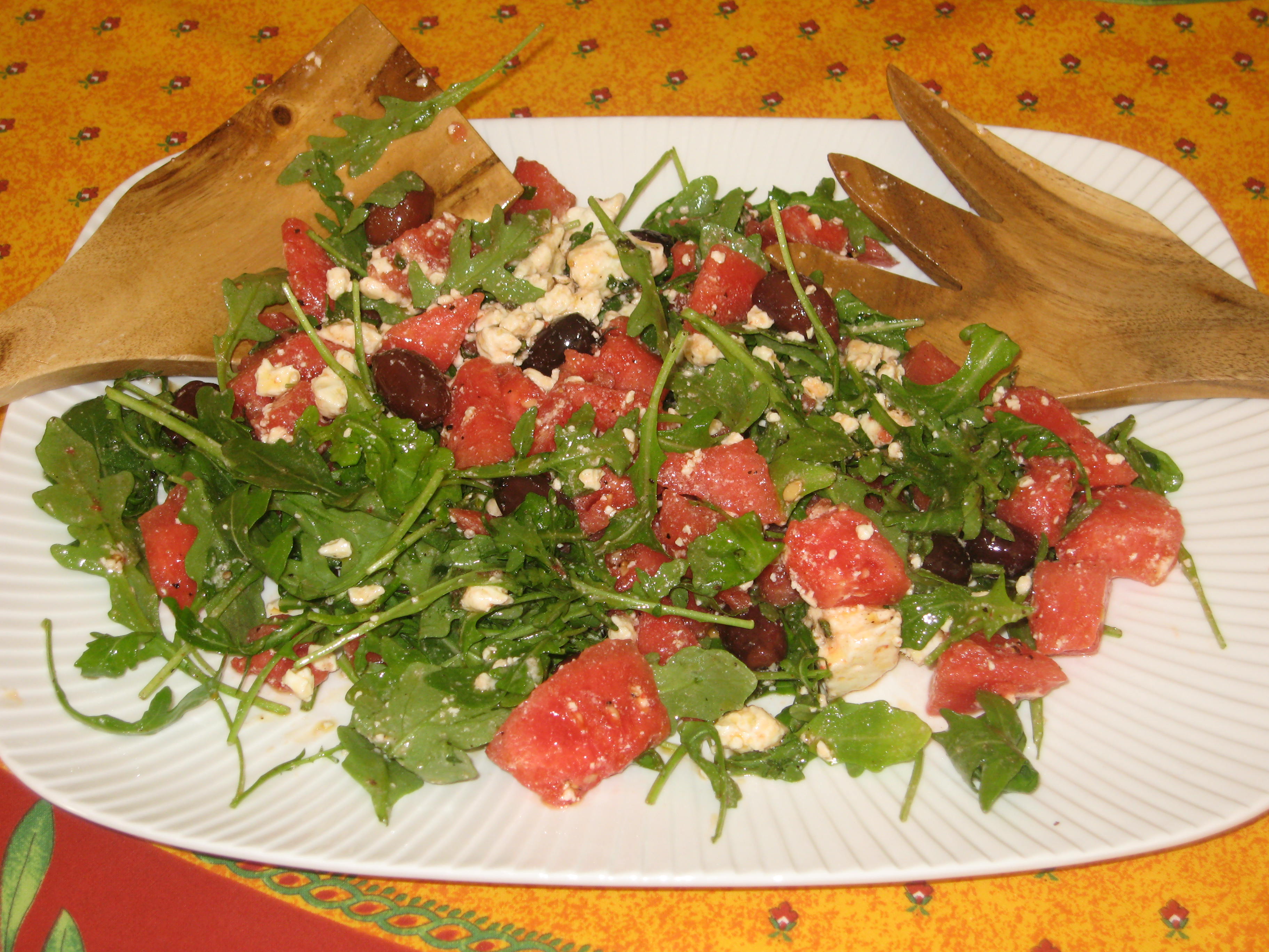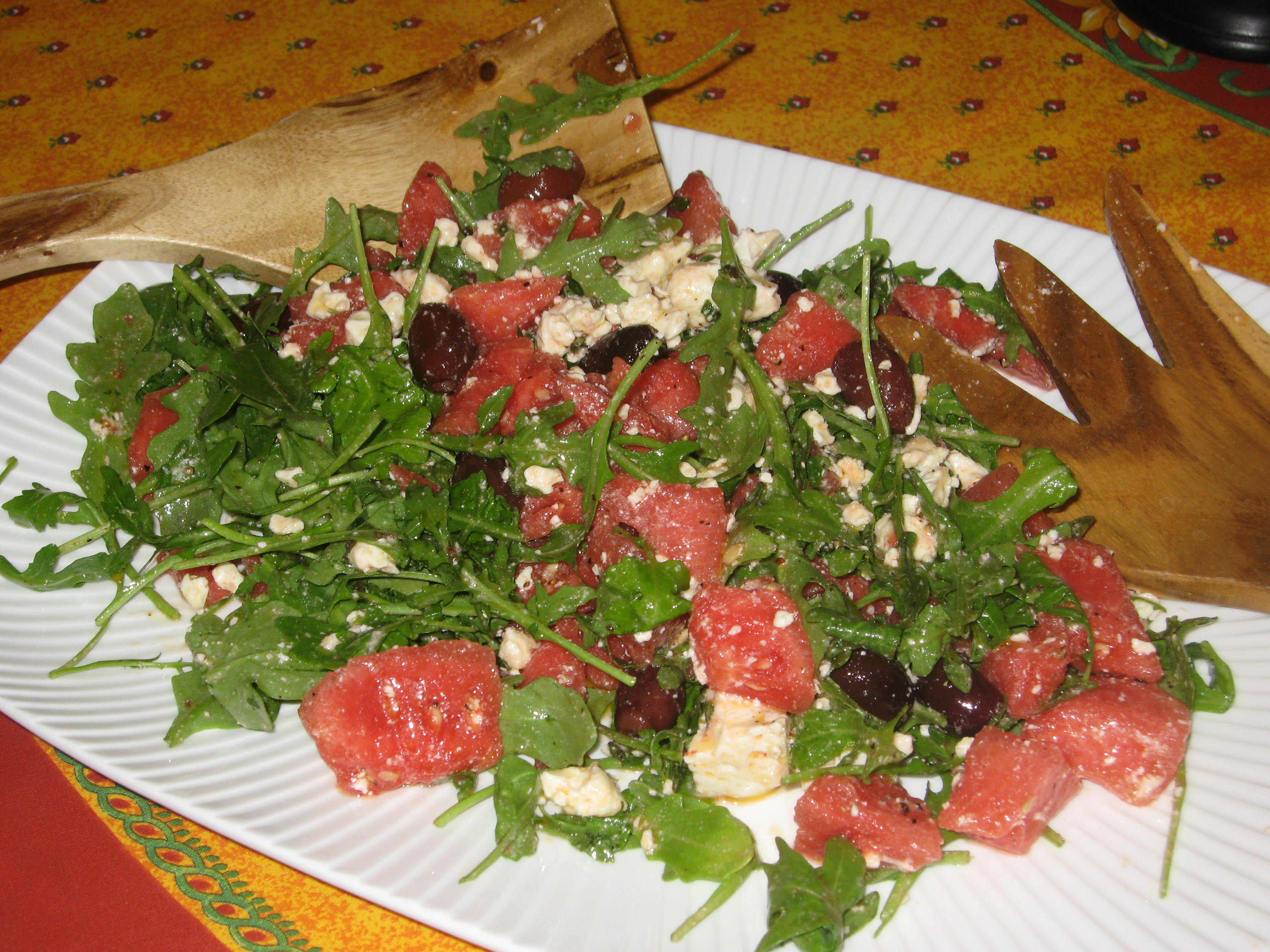 Toss with baby arugula, red onion slices, watermelon cubes, crumbled feta and pitted Kalamata olives.