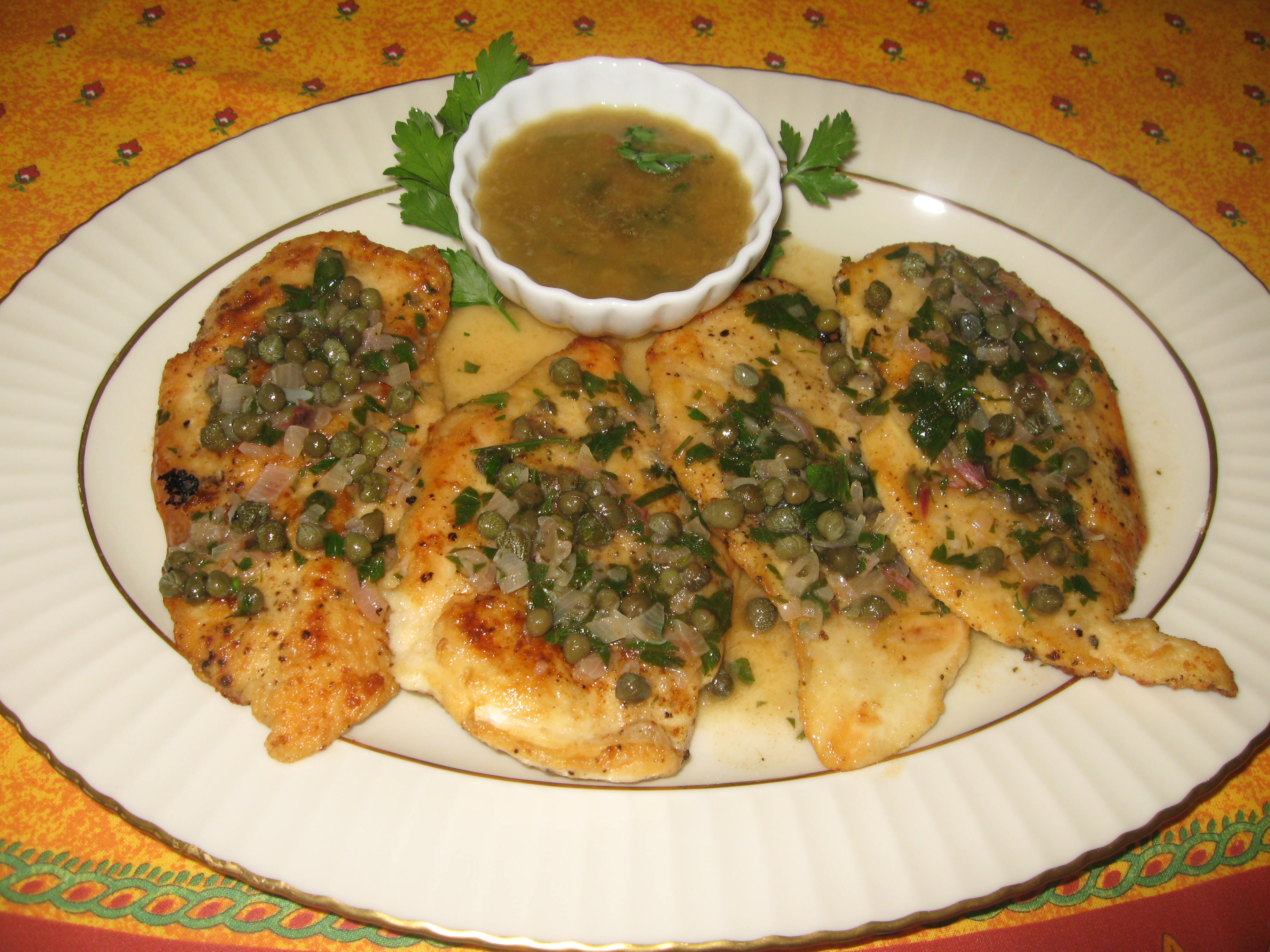 Shake off excess. In fry pan over medium-high heat, warm 2 T of the olive oil. Brown 2 pieces of chicken, turning once, until brown on both sides (2-3 min. per side). Transfer to platter. Repeat with remaining chicken. Reduce heat, melt 1 T butter in pan, add shallots, cook 30 sec., add wine, lemon juice, broth. Reduce (about 5 min.). Remove pan from heat,add remaining 2 T butter, capers, parsley. Drizzle sauce over chicken. Serve some sauce on side.