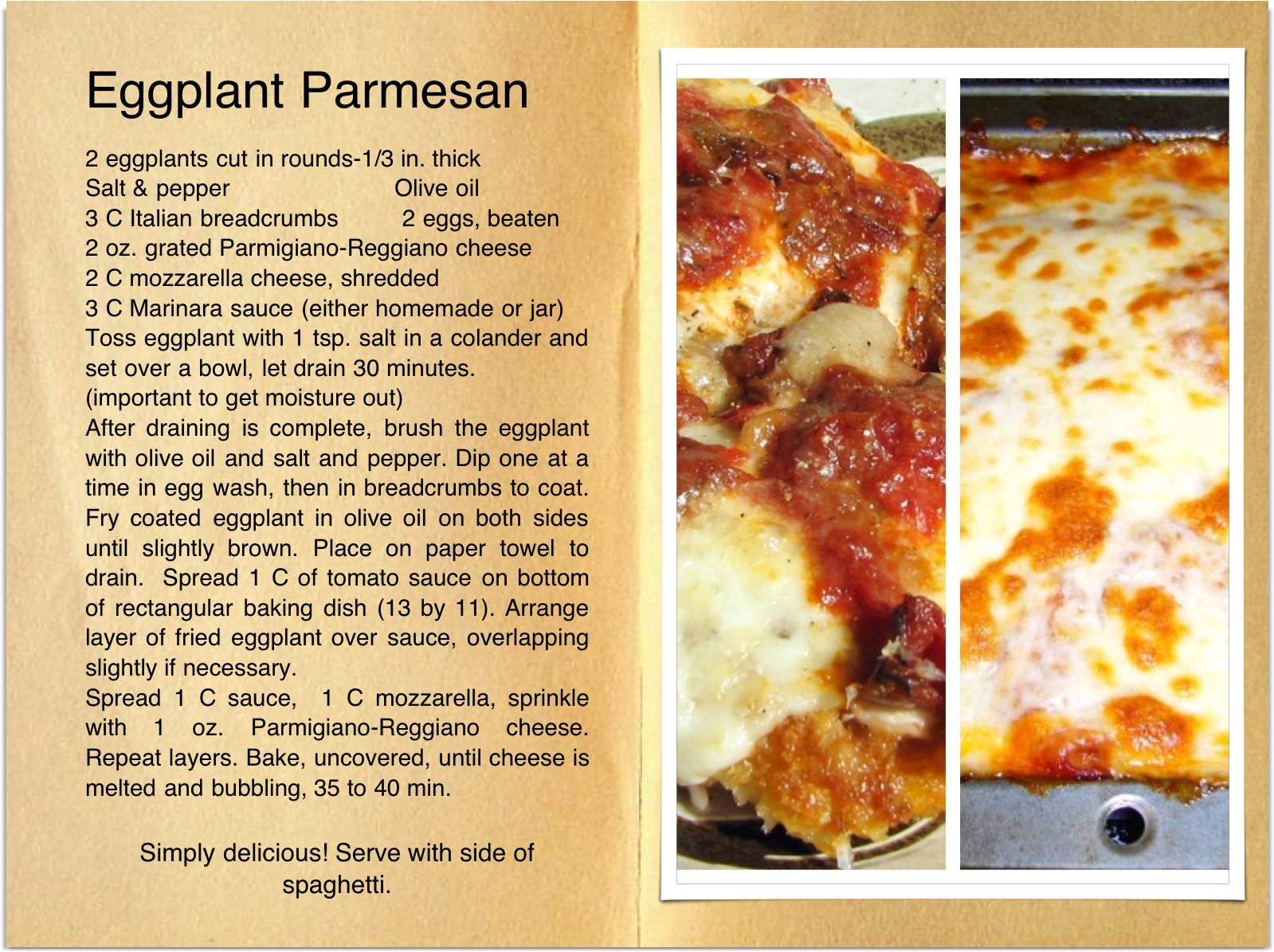 ENTREES EGGPLANT PARMESAN Date: September 6, 2010Author: Mary Moccia 0 Comments Use some of the left over sauce from Dad’s Spaghetti sauce to make this great dish! Share this: Click to print (Opens in new window) Print Click to email a link to a friend (Opens in new window) Email Click to share on Facebook (Opens in new window) Facebook Click to share on X (Opens in new window) X Click to share on LinkedIn (Opens in new window) LinkedIn Click to share on Pinterest (Opens in new window) Pinterest Click to share on Reddit (Opens in new window) Reddit Click to share on Tumblr (Opens in new window) Tumblr Like Loading... Related