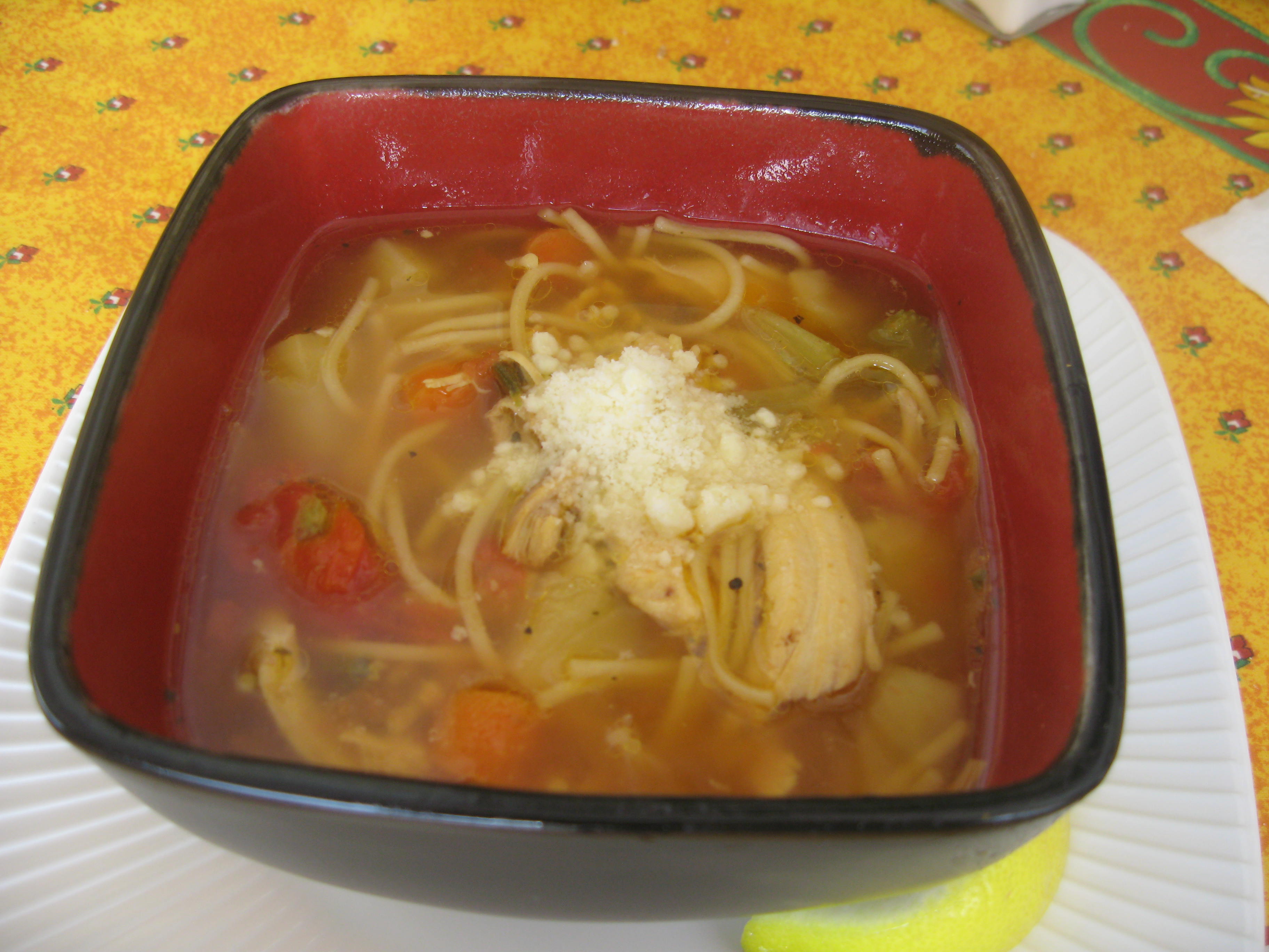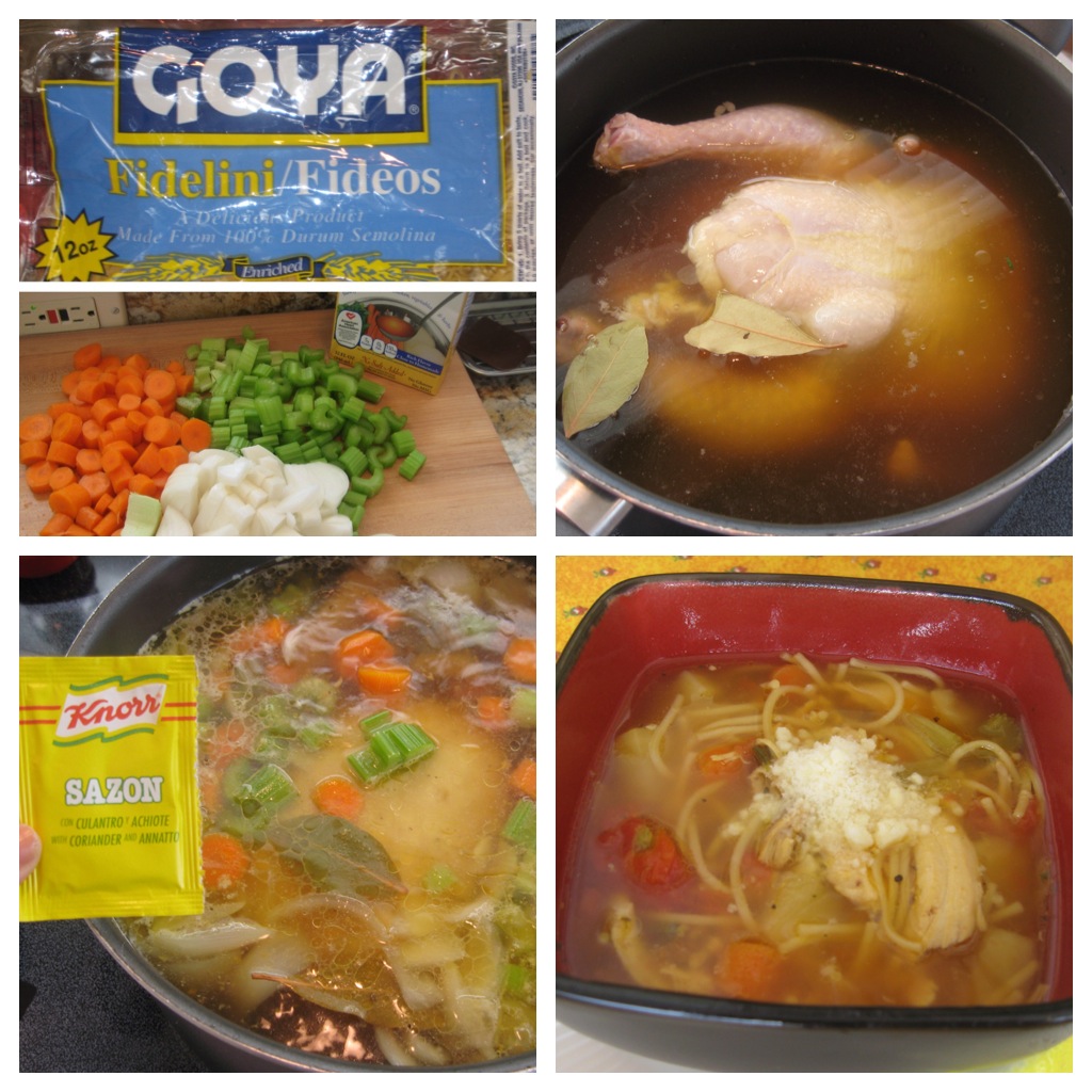 Place whole chicken in extra large pot. Add chicken stock, water, salt, pepper, bay leaves, onion, carrots, celery, and stewed tomatoes with juice. Bring to boil and simmer, for 1 hour, stirring occasionally. Add Knorr Sazon seasoning, potatoes, parmesan cheese, fresh oregano, lemon and zest, and simmer 1/2 hr. more. Take the chicken out of pot, let cool, pick all meat from bones, rough chop meat, add meat back into soup (discard bones). Crush pasta into smaller pieces, place in another pot of boiling water and cook until al dente, drain. Add about 1/2 cooked pasta to soup. Skim any fat from top. Garnish soup with cheese & squeeze of lemon juice.