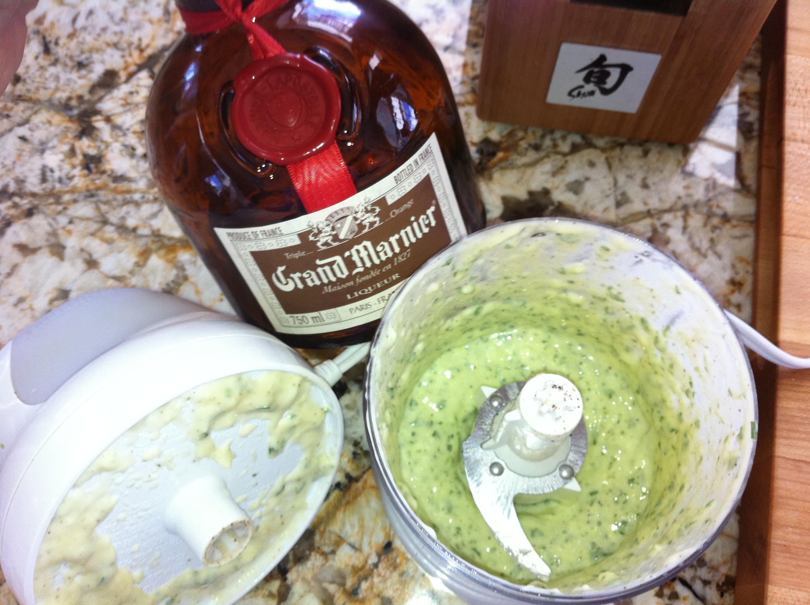 Process butter, basil, garlic, liqueur, salt & pepper in a food processor until smooth. Cover.