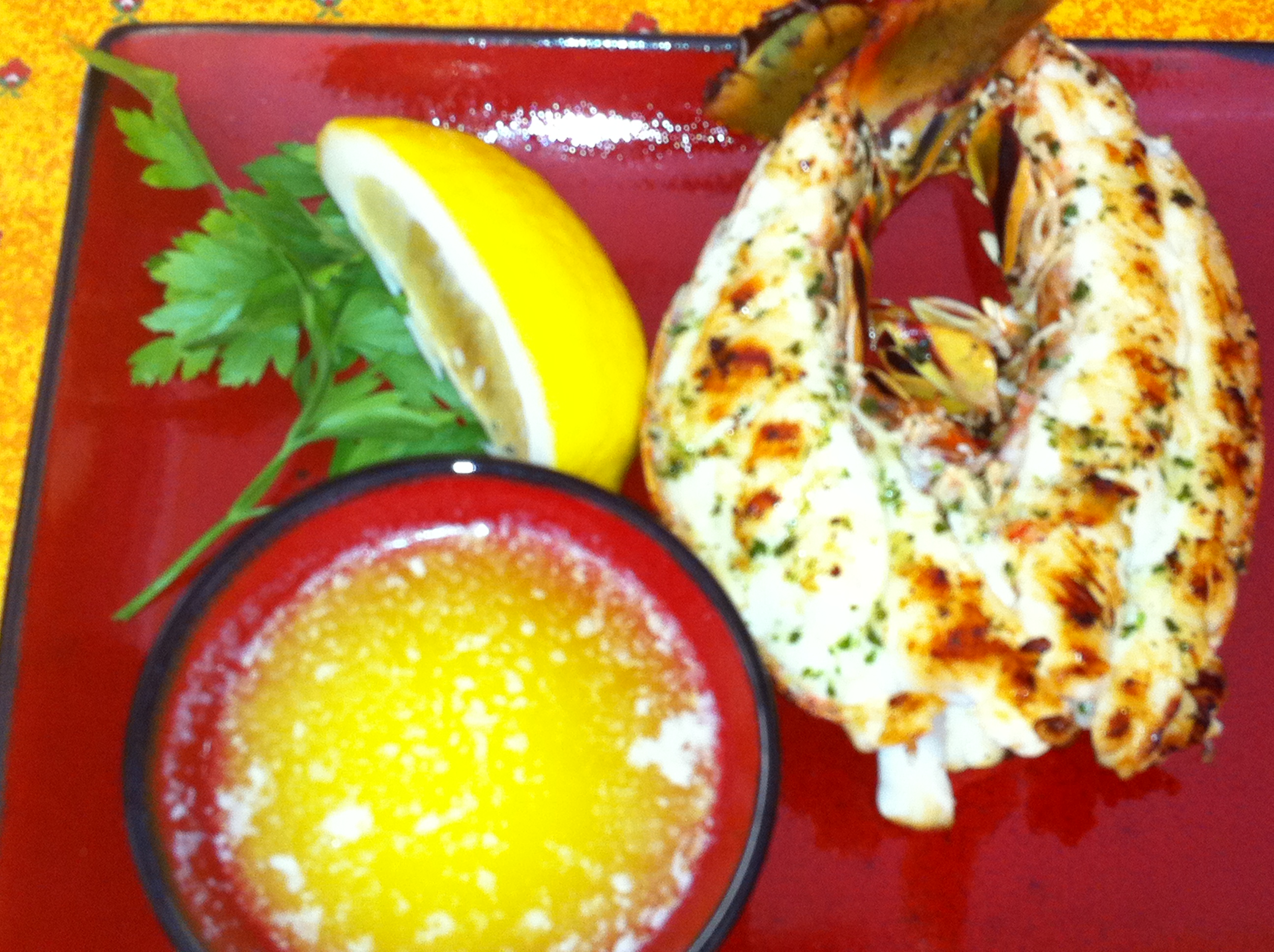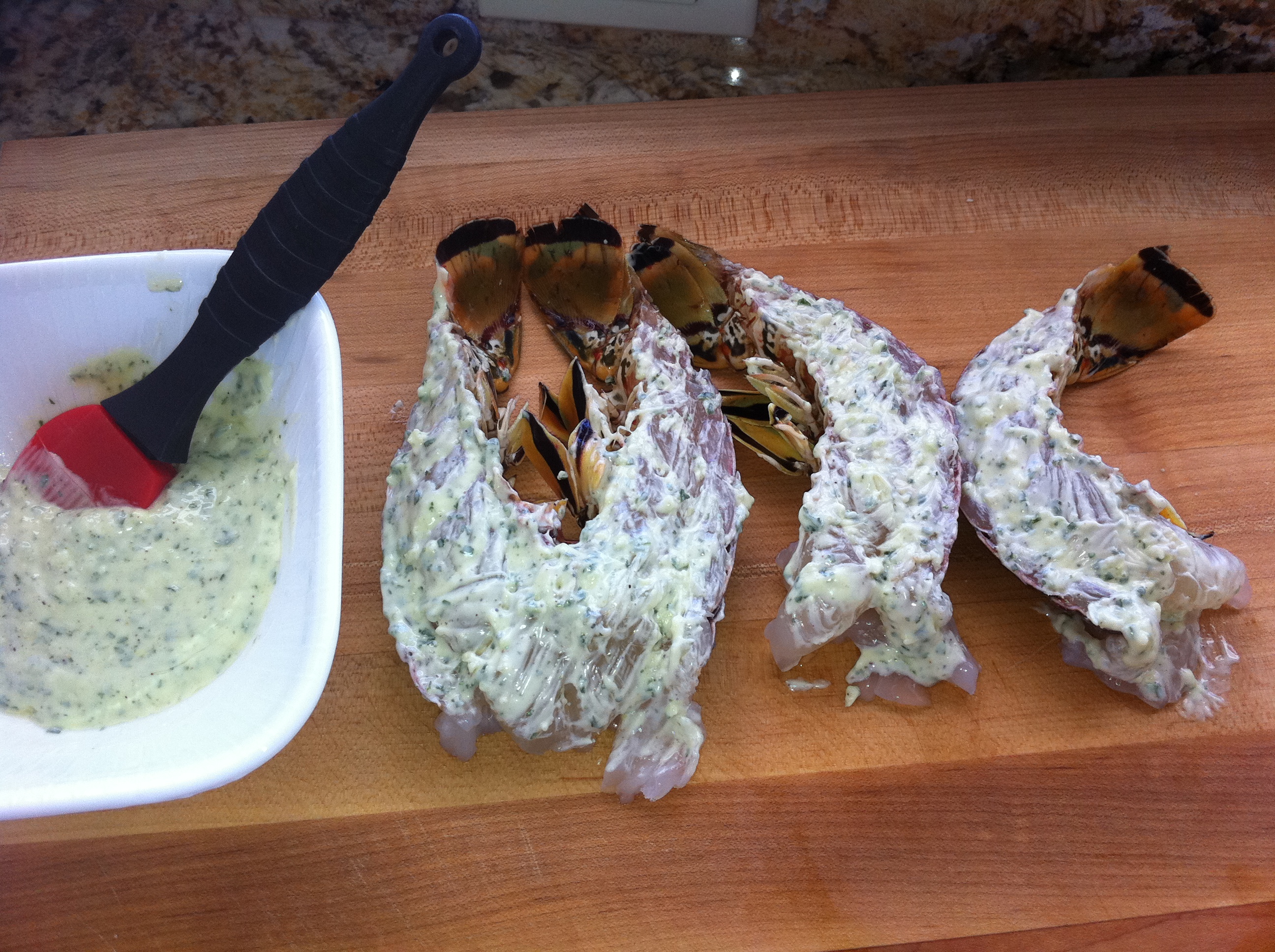 Cut lobster tails in half lengthwise. Spread half of butter mixture over meat, and grill 5 min. per side or until lobster is opaque and completely cooked through. Serve with melted butter on the side. (4 servings)