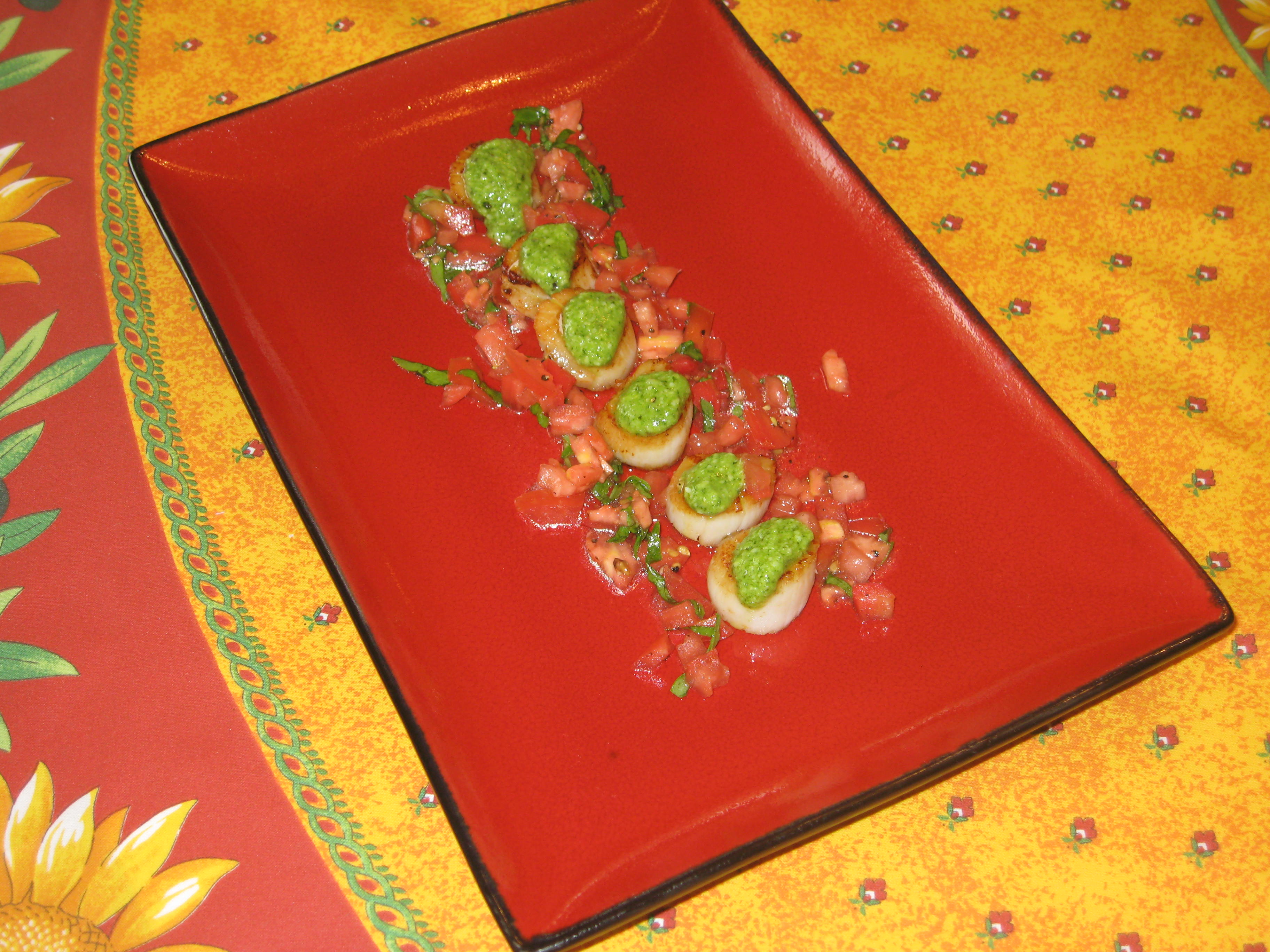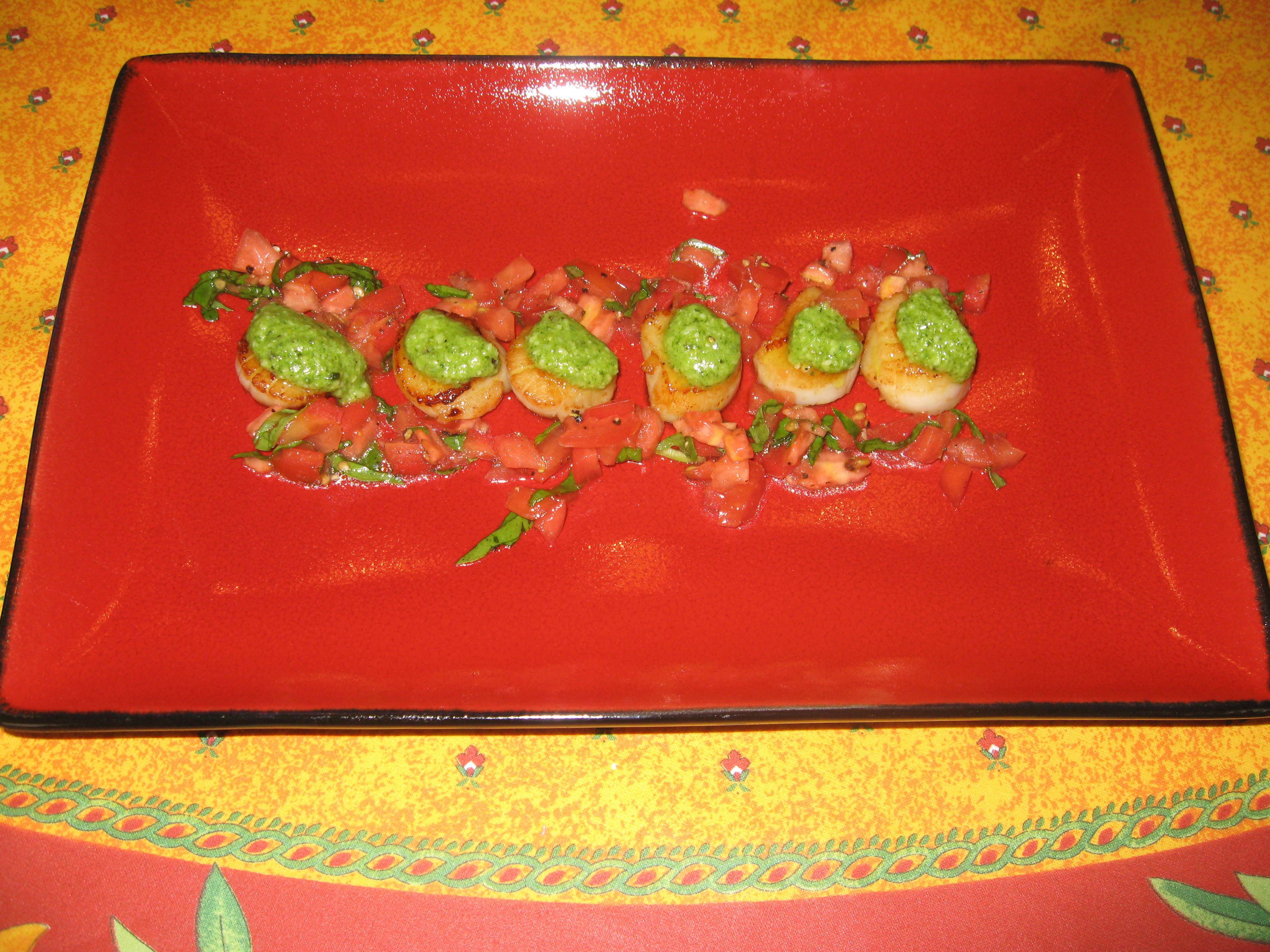 in a food processor, pulse the basil leaves until finely chopped. Add the pine nuts, cheese, garlic and lemon juice. Turn the machine back on and add 1 cup of the olive oil in a slow, steady stream. Season the pesto with salt and pepper. Place the pesto in a bowl and cover with plastic wrap. In a small bowl, combine the tomato and shredded basil, salt & pepper to taste, splash olive oil, and set aside, In a large skillet, heat the remaining 2 T of olive oil over med.-high heat until almost smoking. Add the scallops and sear until golden brown, about 2 min. per side. Transfer to a plate, drizzle 1 T of the pesto on each scallop, arrange tomato & basil around scallops. (4 servings)