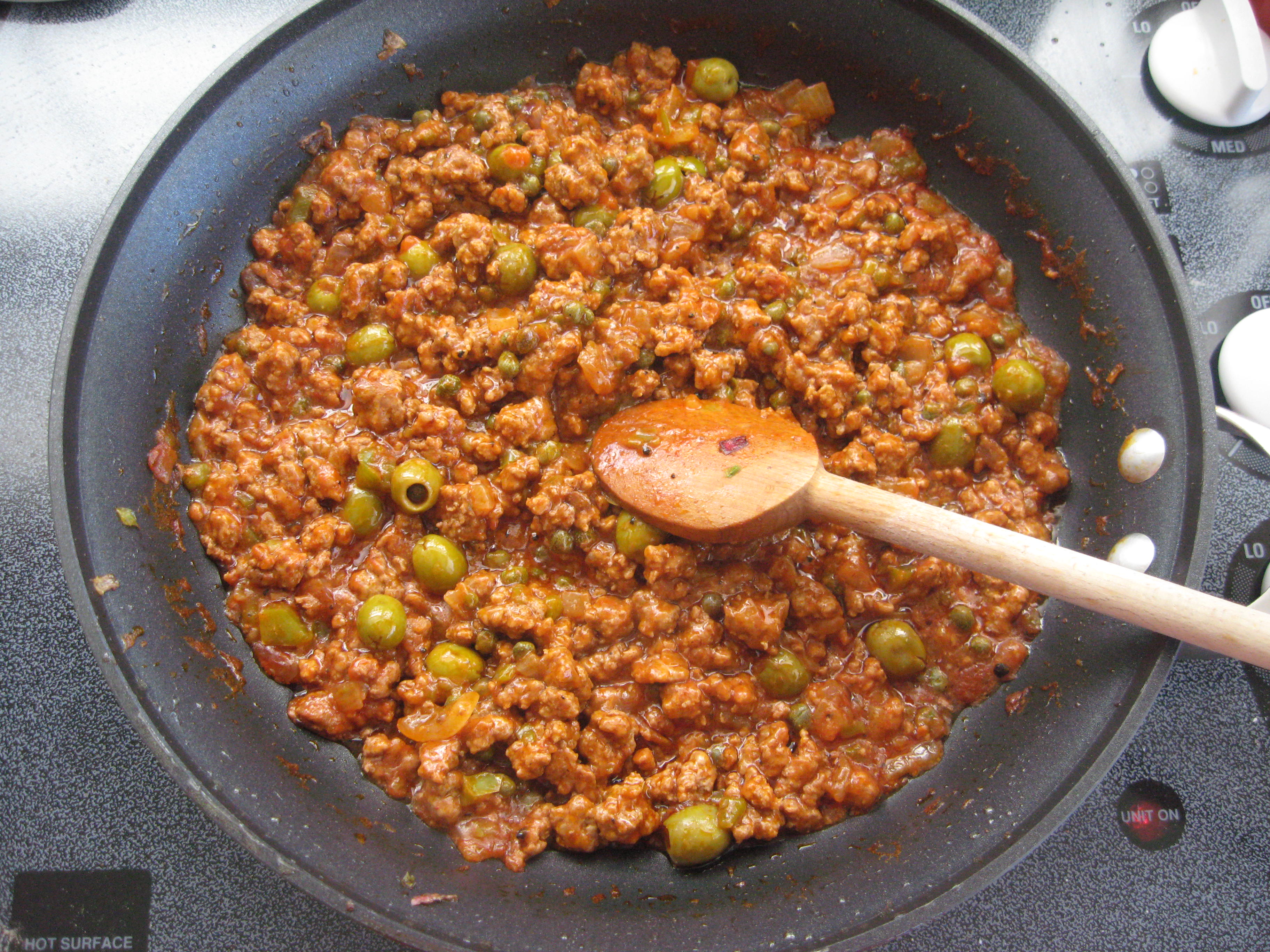Add salt & pepper, diced tomatoes, tomato sauce, tomato paste, and 2 T Sofrito.  Add the dried oregano, cumin, and paprika. Stir and add the olives, capers, and raisins. Simmer on low for 25 to 30 min. until most of the liquid is absorbed. Stirring frequently.