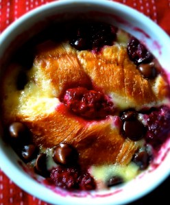 Preheat oven to 425. Place baking tray in middle of oven. Brush 4 ramekins with butter. Chop croissants into bite size chunks, mix with rasp.& chips and divide between dishes. Spoon 1 T syrup over contents of each dish. Heat milk until almost boiling than quickly beat in eggs and vanilla, pour over mixture, pressing down lightly, drizzle remaining butter, sprinkle nutmeg. Place on tray, bake 20 min. Serve hot. Serves 4.