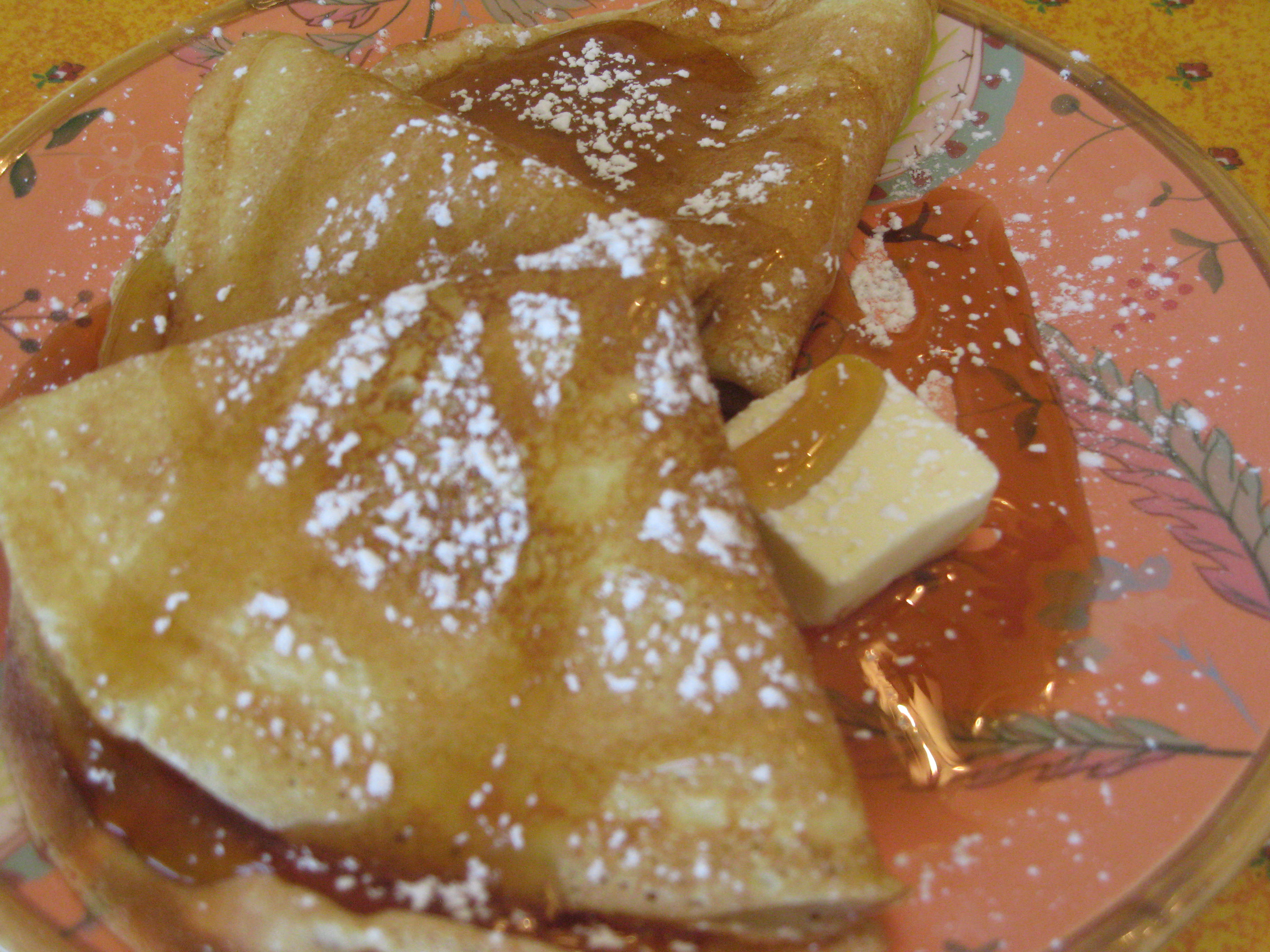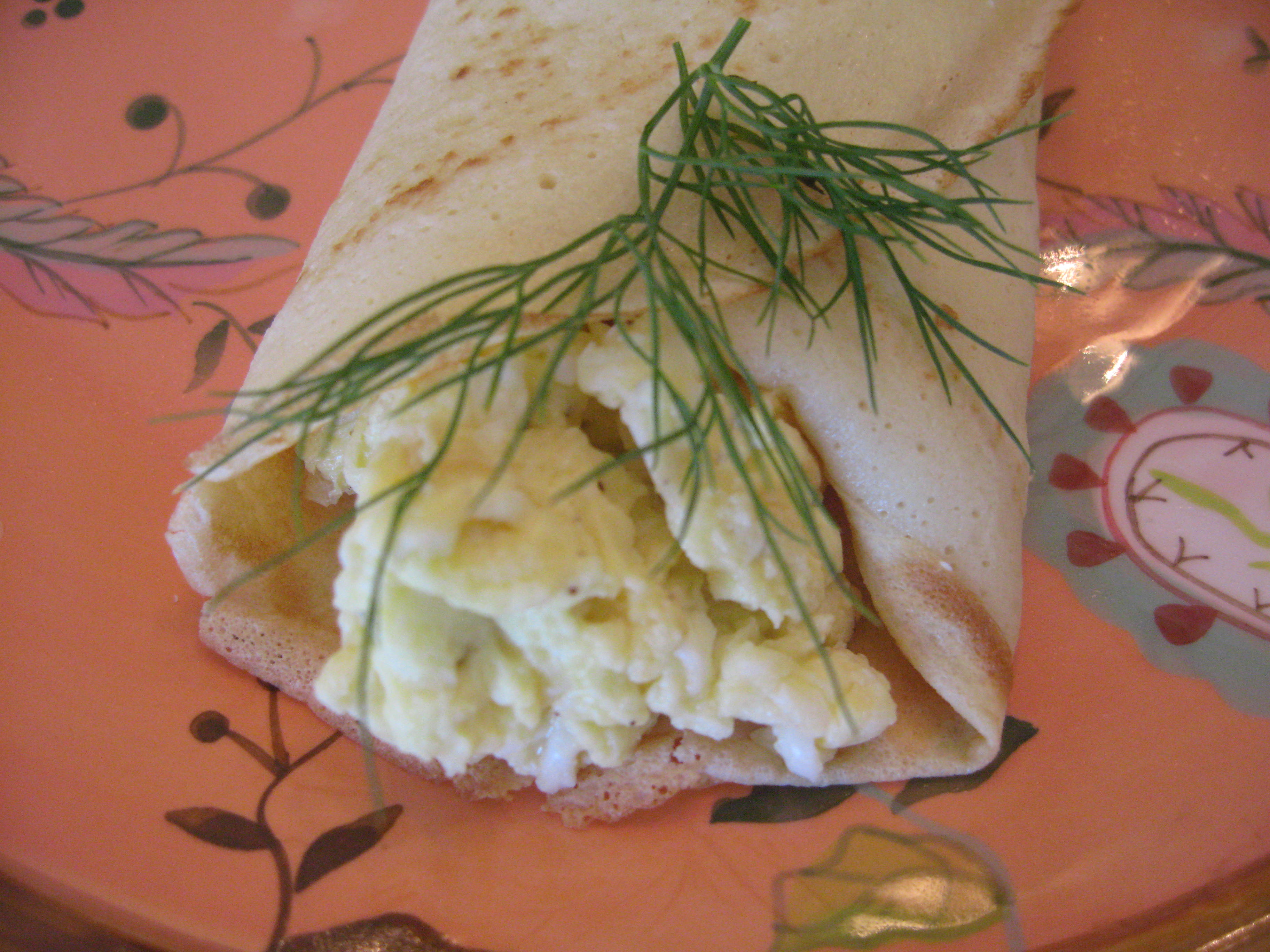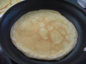 Use non-stick pan 8-10 in. Heat until water dances when you drop on it. Add 1/3 C batter, swirl around in pan 45 sec. to coat. Flip over for 15 sec. more. Set aside. Makes about 7.