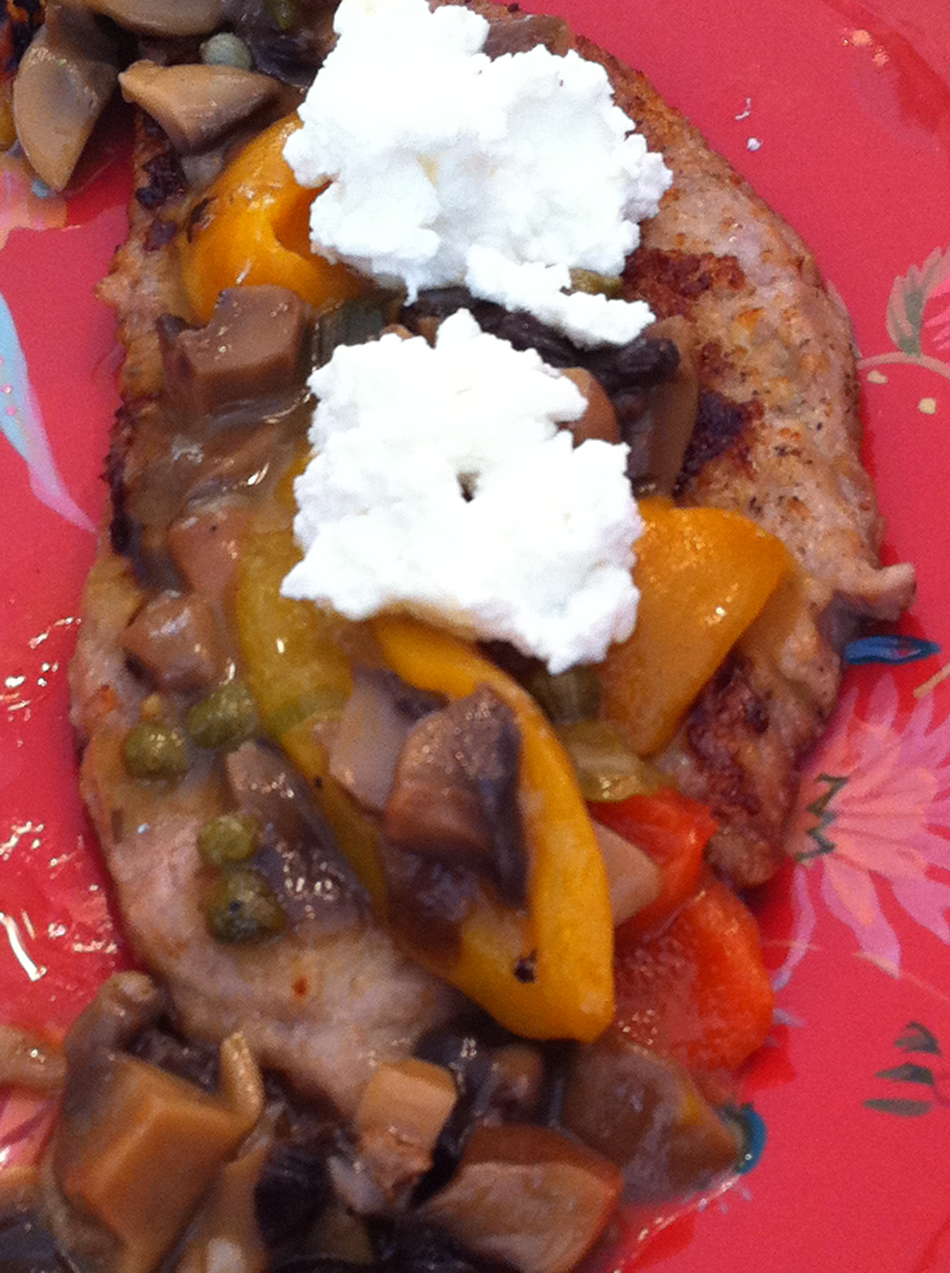 Pound veal until 1/4 in. thick. Salt & pepper both sides, dredge in flour and fry in olive oil approx. 2 min. Remove to plate,keep warm. Add butter to pan, saute shallots 2 min., add wine, capers, mushrooms, red peppers and beef broth. Stir, cook 3 min. Serve on top of veal, then add two T of goat cheese on top. Serves 6