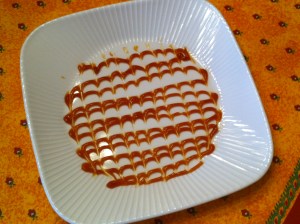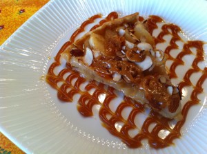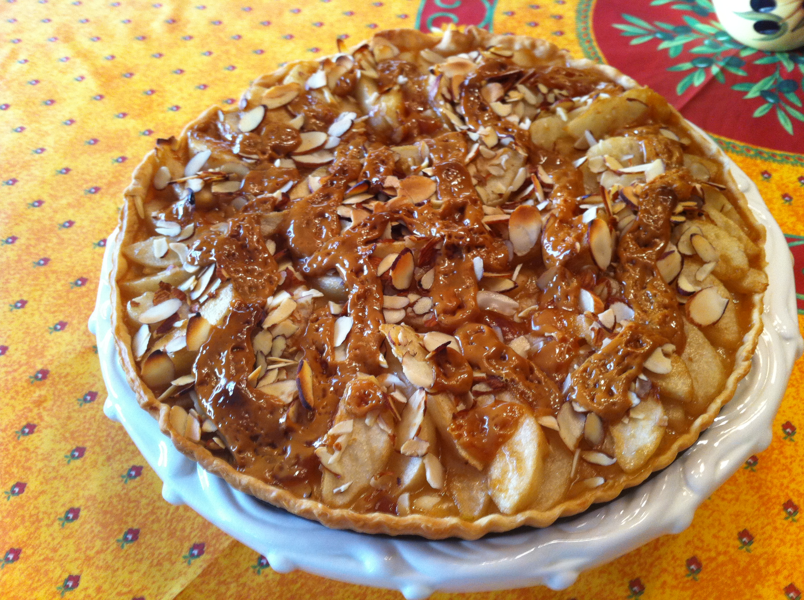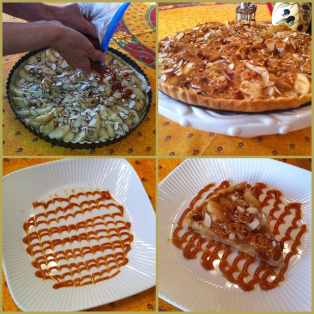 After you take the tart out of the oven, measure approx. 1 cup of the Marzetti Caramel Sauce and place it in a small plastic bag, cut a very small hole in the corner of the bag and drizzle the caramel sauce over the pears and almonds. (Reserve bag with caramel sauce for later use).