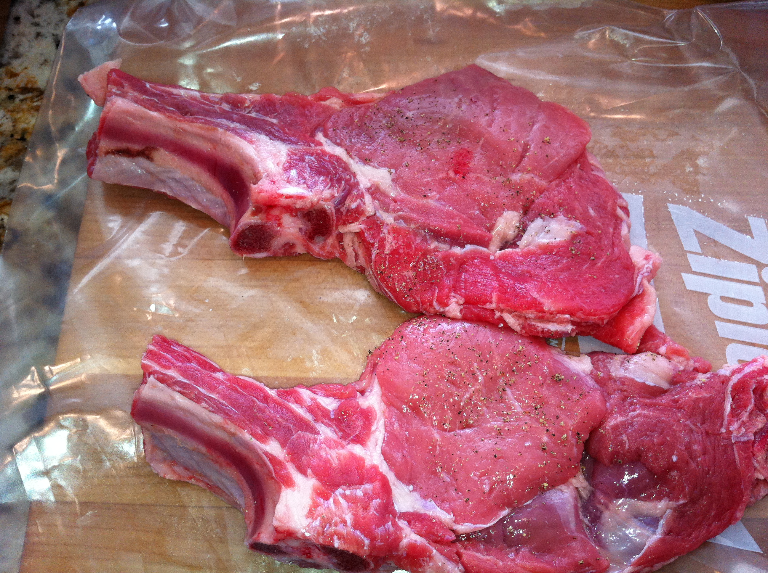 Heat large saute pan over medium heat, add olive oil and butter. When hot, brown chops on both sides (about 3 minutes per side). Remove to paper tower-lined pan and place in warm oven (170 degrees) until ready to serve.