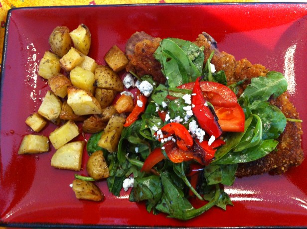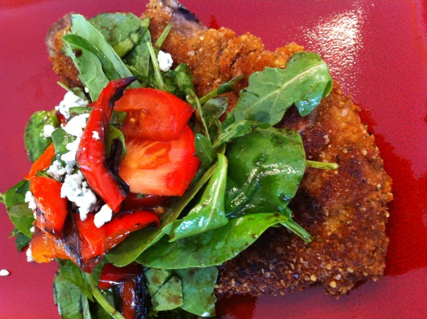 Place veal chop on plate, top with arugula salad. Add strips of grilled red bell pepper (cut in half) and a T of blue cheese crumbles.