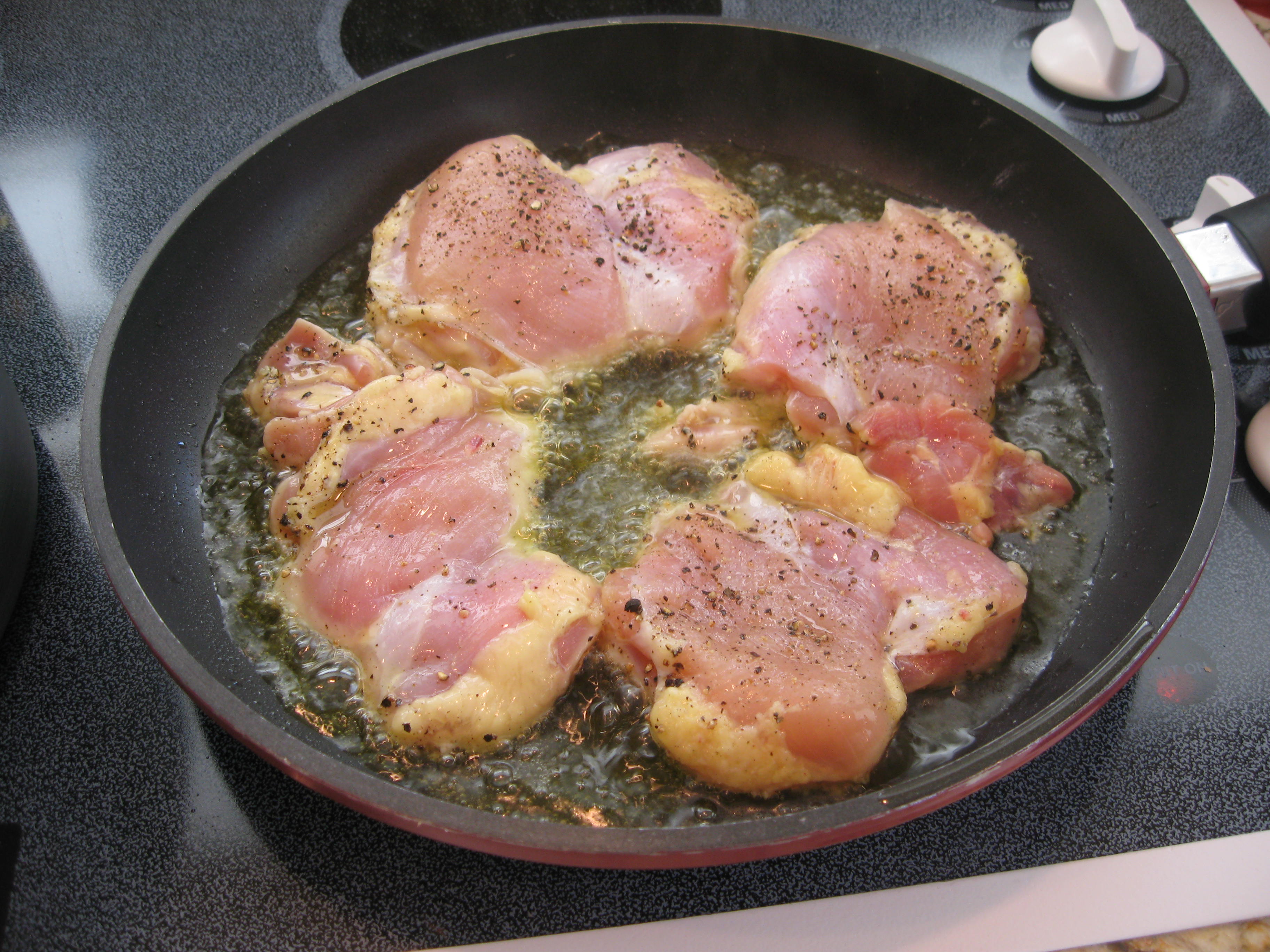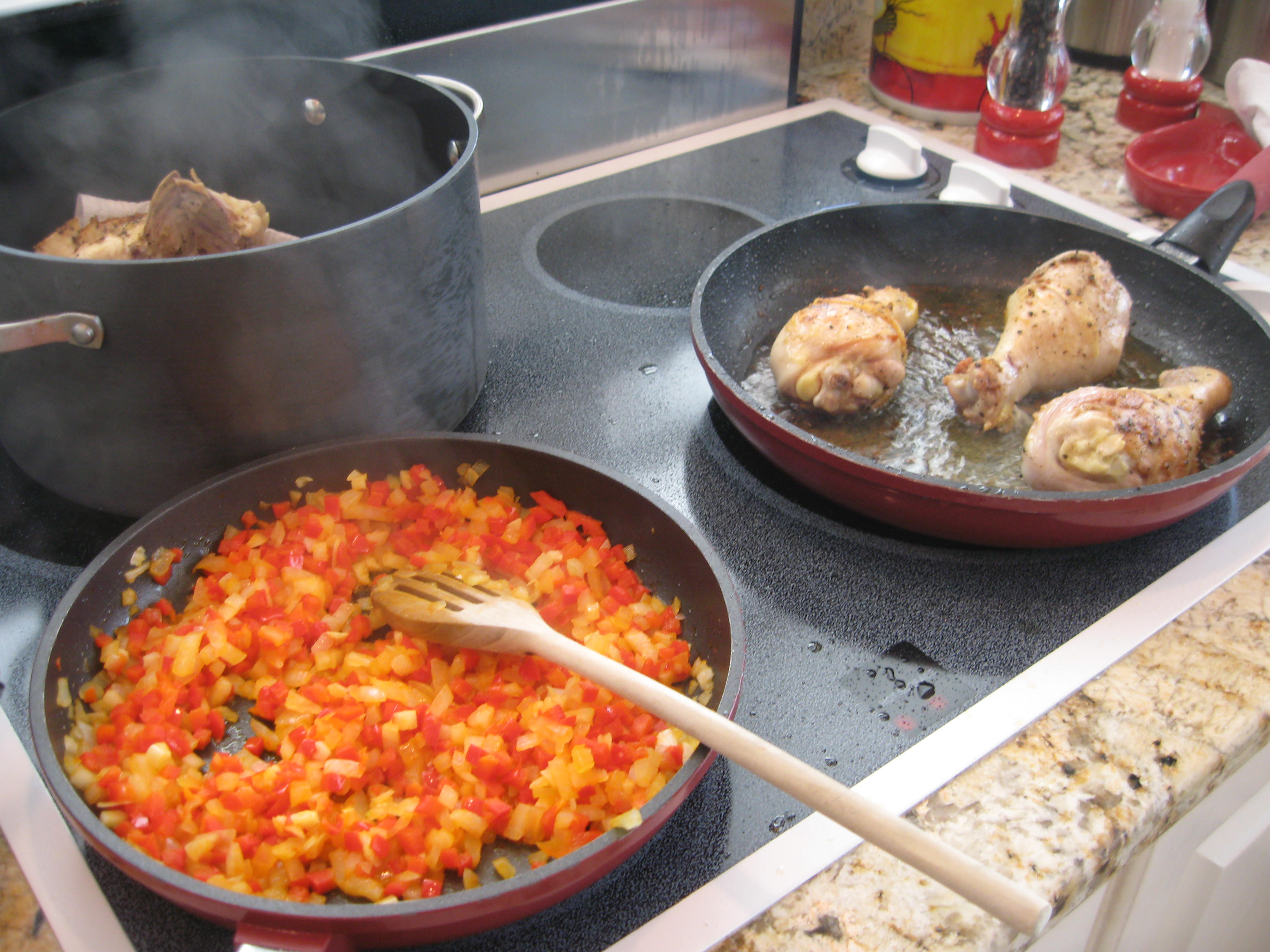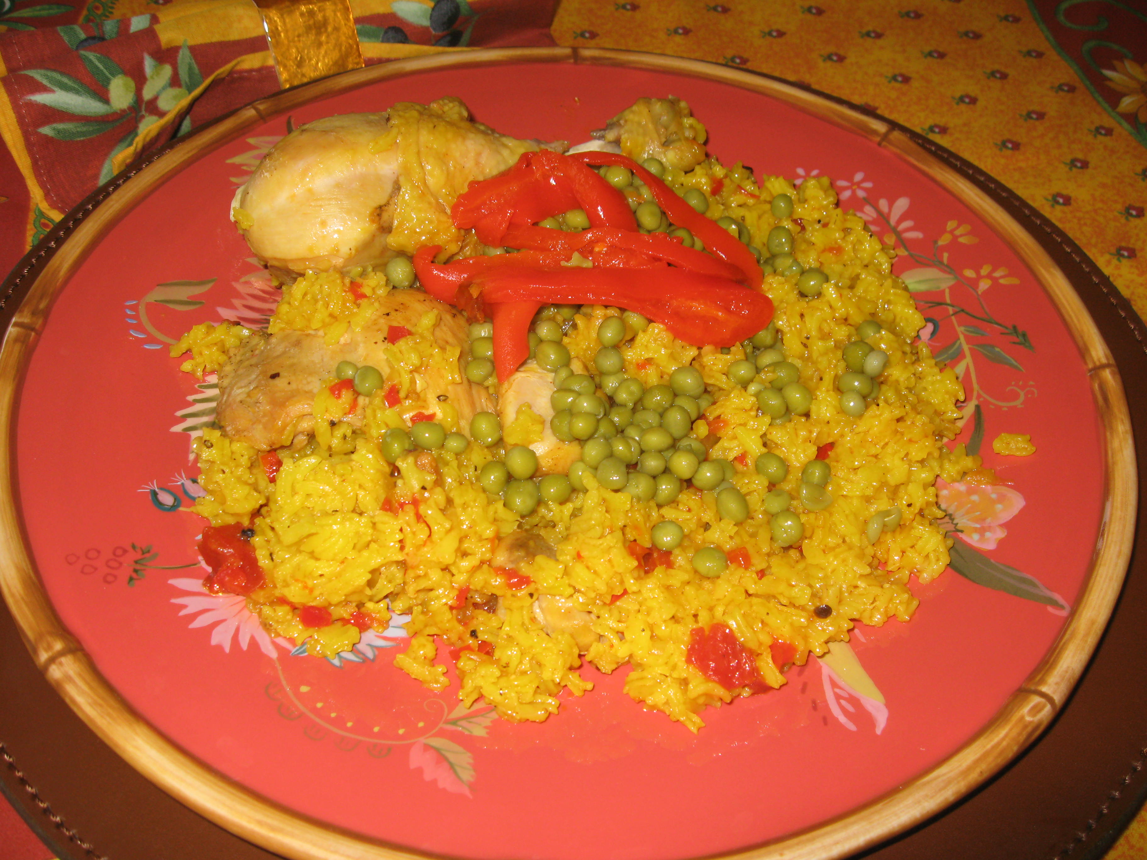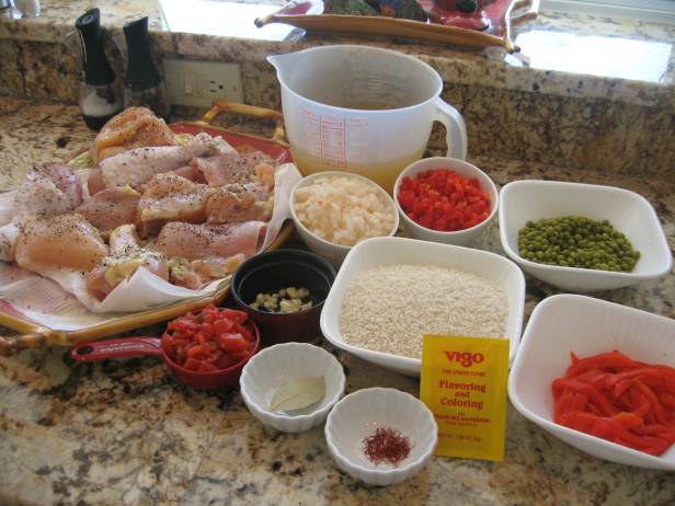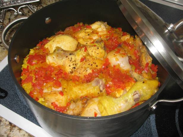 - Rinse & pat dry chicken, then salt and pepper. Fry chicken in 1/2 C olive oil.Brown both sides, set aside. Chop bell pepper, onion, & garlic and fry in 2 T of olive oil until soft. In dutch oven, or large pot, place broth, add fried chicken, stewed tomatoes, bay leaf, onion mixture, yellow seasoning, and saffron; bring to boil. Let boil 5. Add rice, bring back to boil, stir well, cover and place covered in oven. Bake for 30 to 35 minutes (all liquid should be gone). Remove from oven. When serving, top with chopped pimentos and peas.
