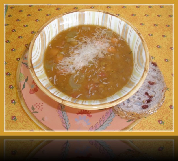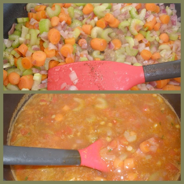 Rinse and pick over lentils. Fry onions in large dutch oven in olive oil until translucent, add carrots, celery, diced tomatoes with the juices, and cut up ham.