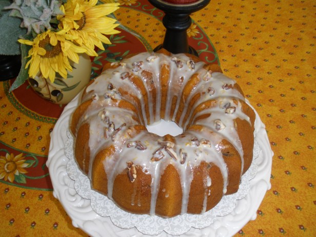 Combine confectioner sugar, orange peel, and orange juice in a small bowl. Sir with a spoon to blend. Spool over top of cooled cake, letting excess run down the sides. Sprinkle with chopped nuts before glaze hardens. (I spool the glaze over the cake while the cake is on a cooling rack, with paper towels underneath to catch the excess glaze, then put it on the cake plate.)