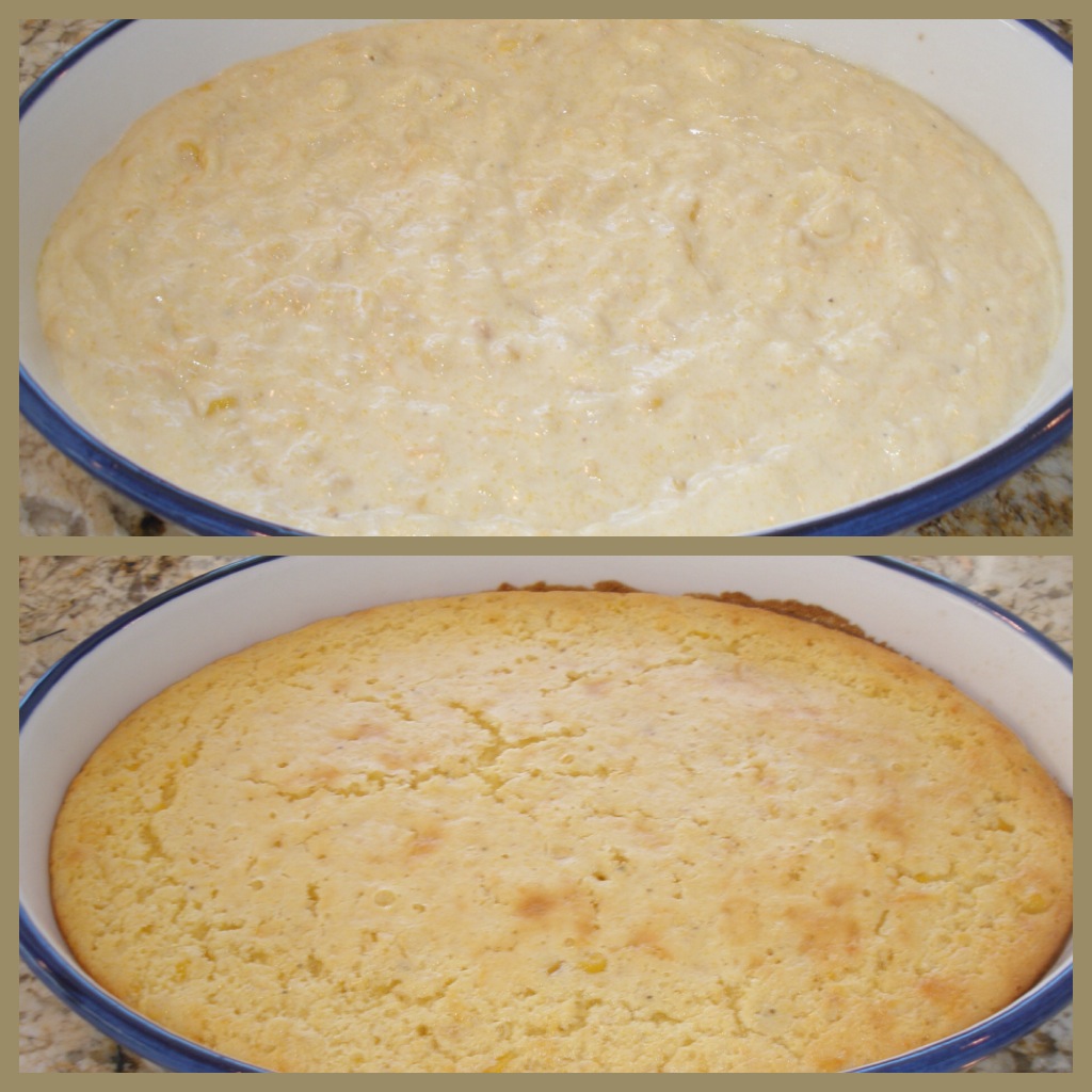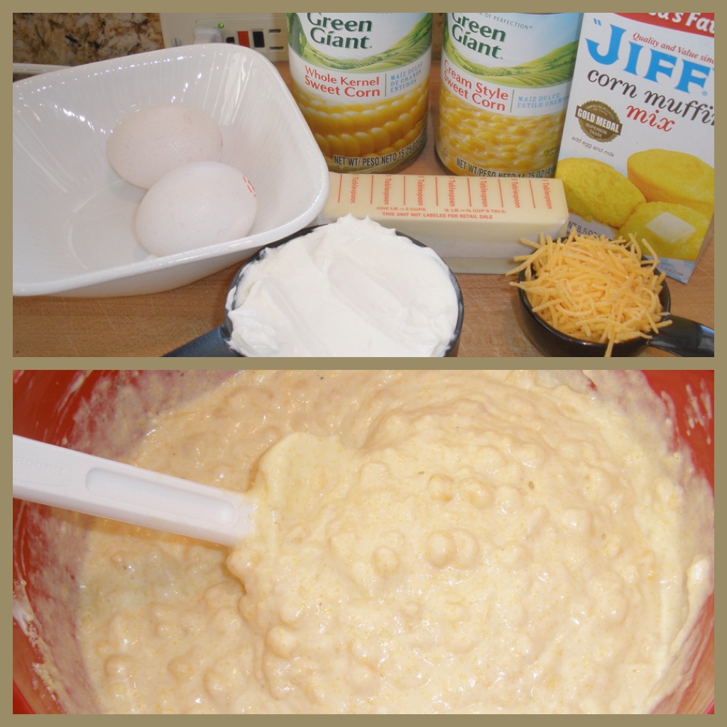 Preheat oven to 375 degrees. Grease 7 by 11 inch baking dish or equivalent. Melt butter and beat eggs. Drain the whole-kernel corn. Combine all the ingredients together, add the muffin mix last and blend with a large spoon. Pour mixture into a greased baking dish. Bake at 375 degrees for 40 to 45 minutes or until light golden brown. Serves 10 as a side.