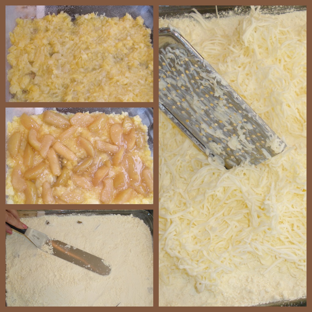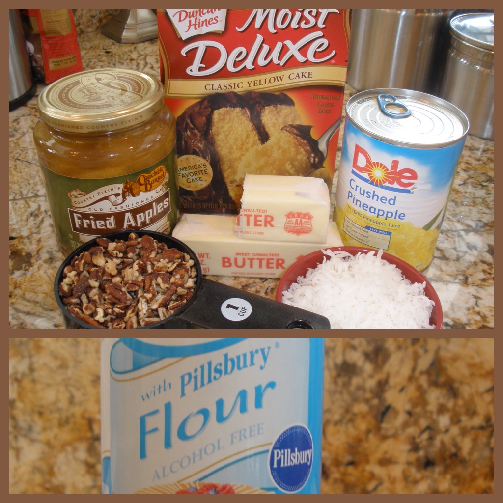 Preheat oven to 325 degrees. Grease 9 x 13 pan. Spread layer of pineapple with juice in pan. Top with layer of apple pie filling. Sprinkle cake mix over apples. Use a hand held grater and take cold butter and grate the butter evenly over the cake mix.