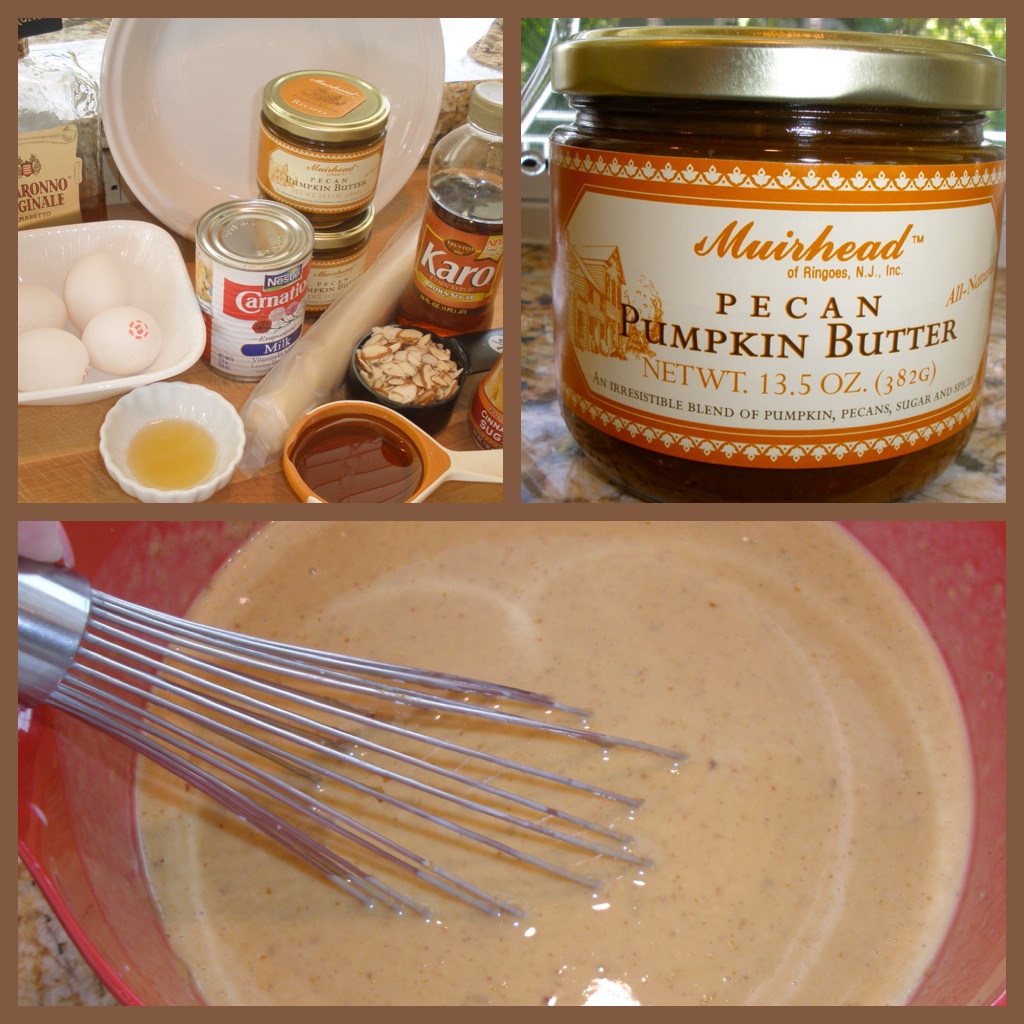 In a large bowl, gently whisk the eggs. Add the Pecan Pumpkin Butter and evaporated milk and whisk until well combined. Pour into the prebaked pie shell and bake until the center is set, approximately 1 hour and 15 minutes. At this time, pour on the Almond Amaretto Glaze and spread around with a spatula as evenly as you can. Bake for an additional 10 minutes.