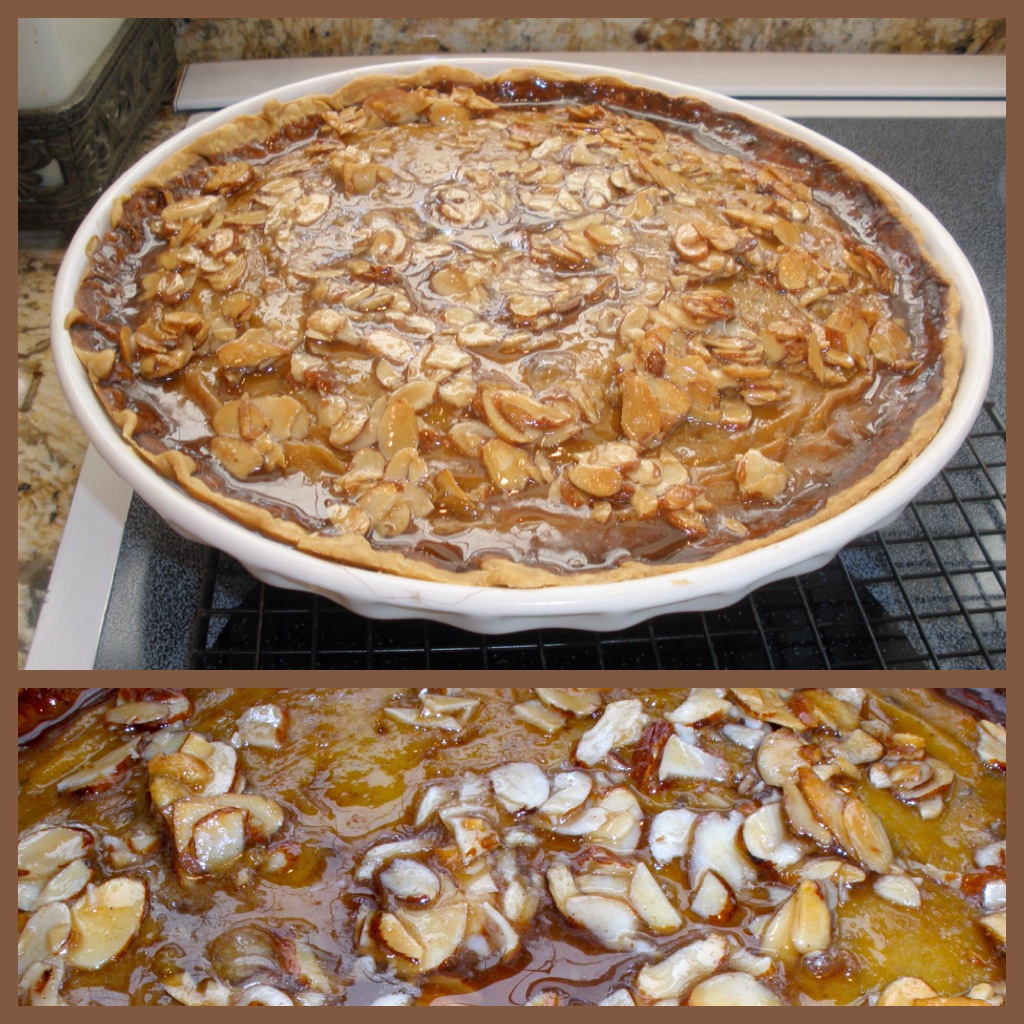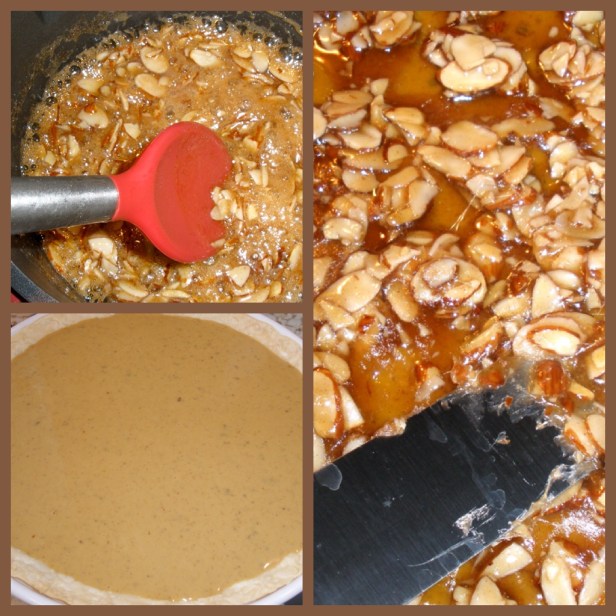 Around 15 minutes before the pie is done, mix the Karo Syrup, almonds, Amaretto, and cinnamon sugar in a small saucepan until bubbling. Reduce heat and stir until it thickens for around 5 minutes. Set aside until you top the pie, if it gets too hard, reheat on stove.