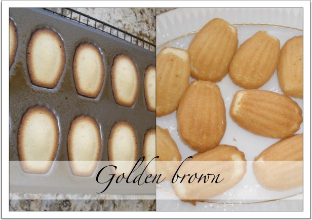 Preheat oven to 350 degrees. Spray coat your madeleine pans or butter and flour (two 12 hole madeleine pans) or use the same one twice. In an electric mixer, beat the eggs and granulated sugar until creamy. Add the vanilla, lemon peel, & salt. Slowly add in the flour and beat until just blended. Gradually add in the flour and beat until just blended. Gradually add in the cooled butter in a steady stream and mix in well.