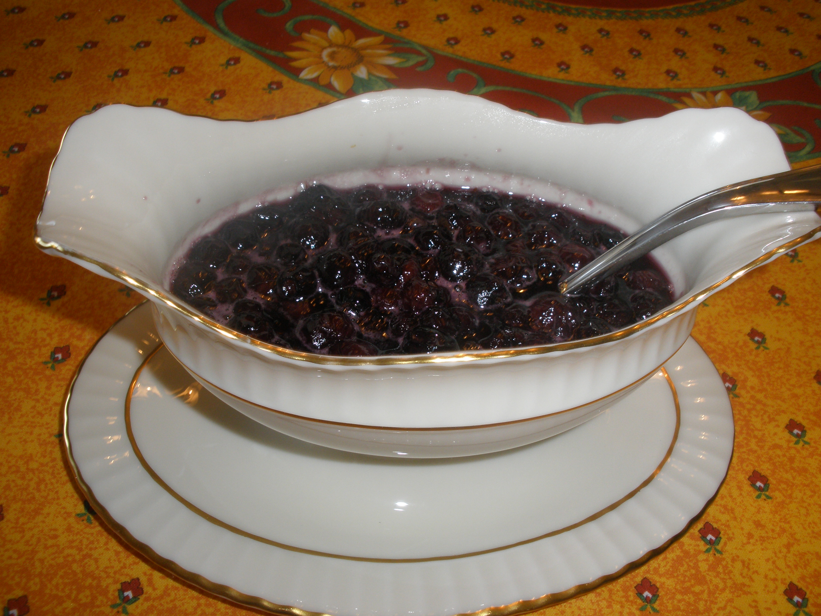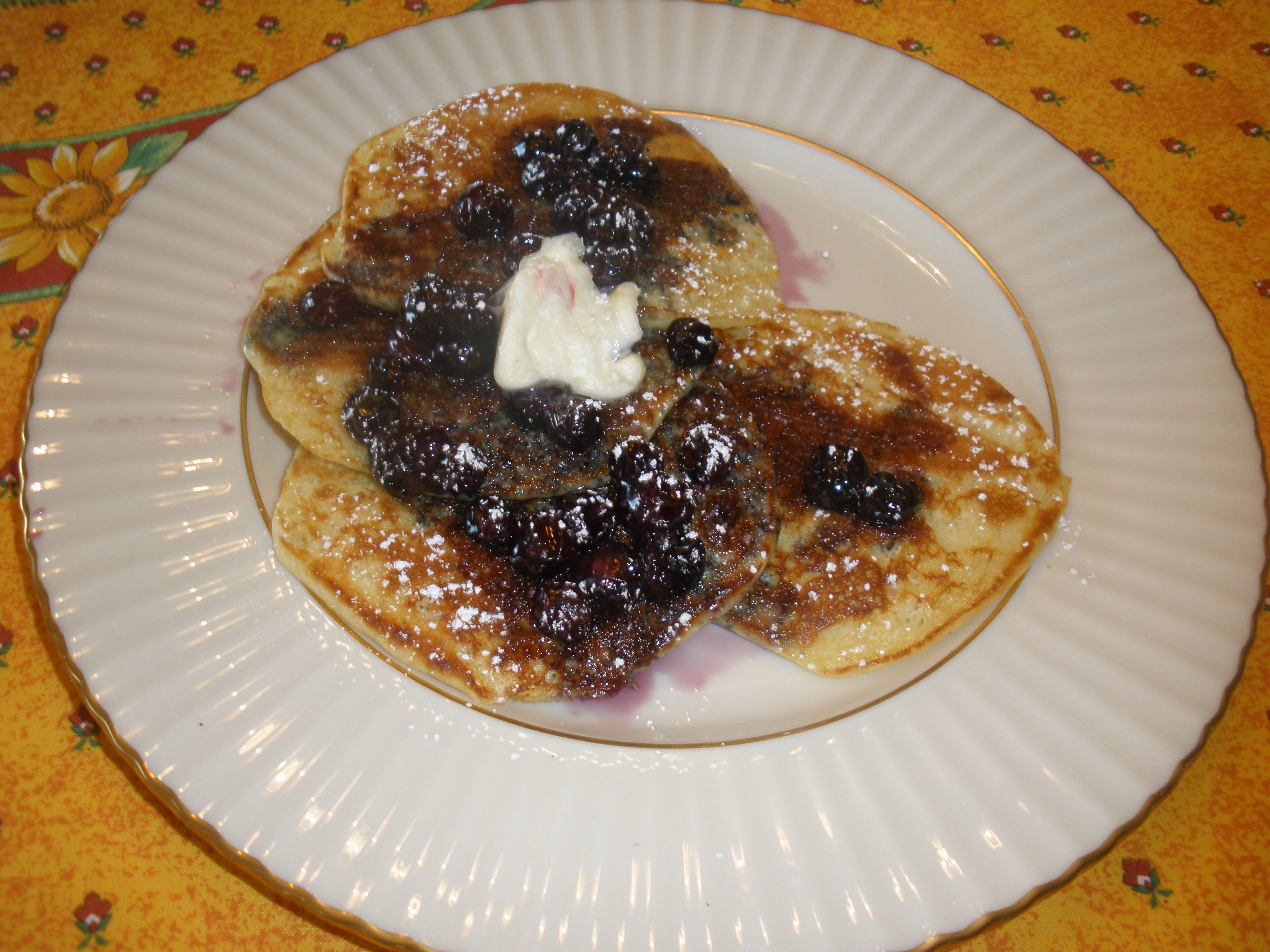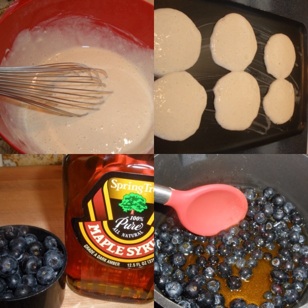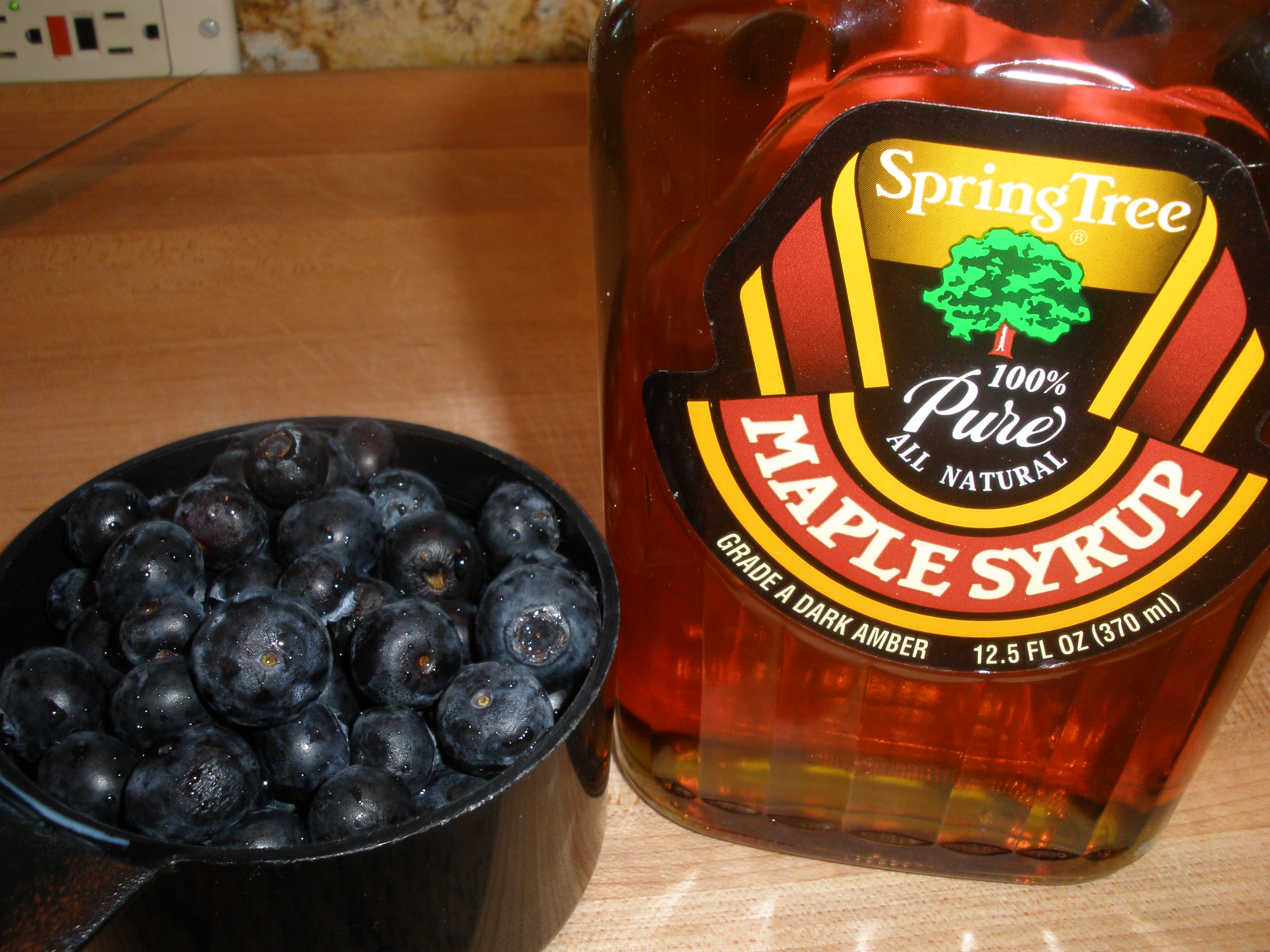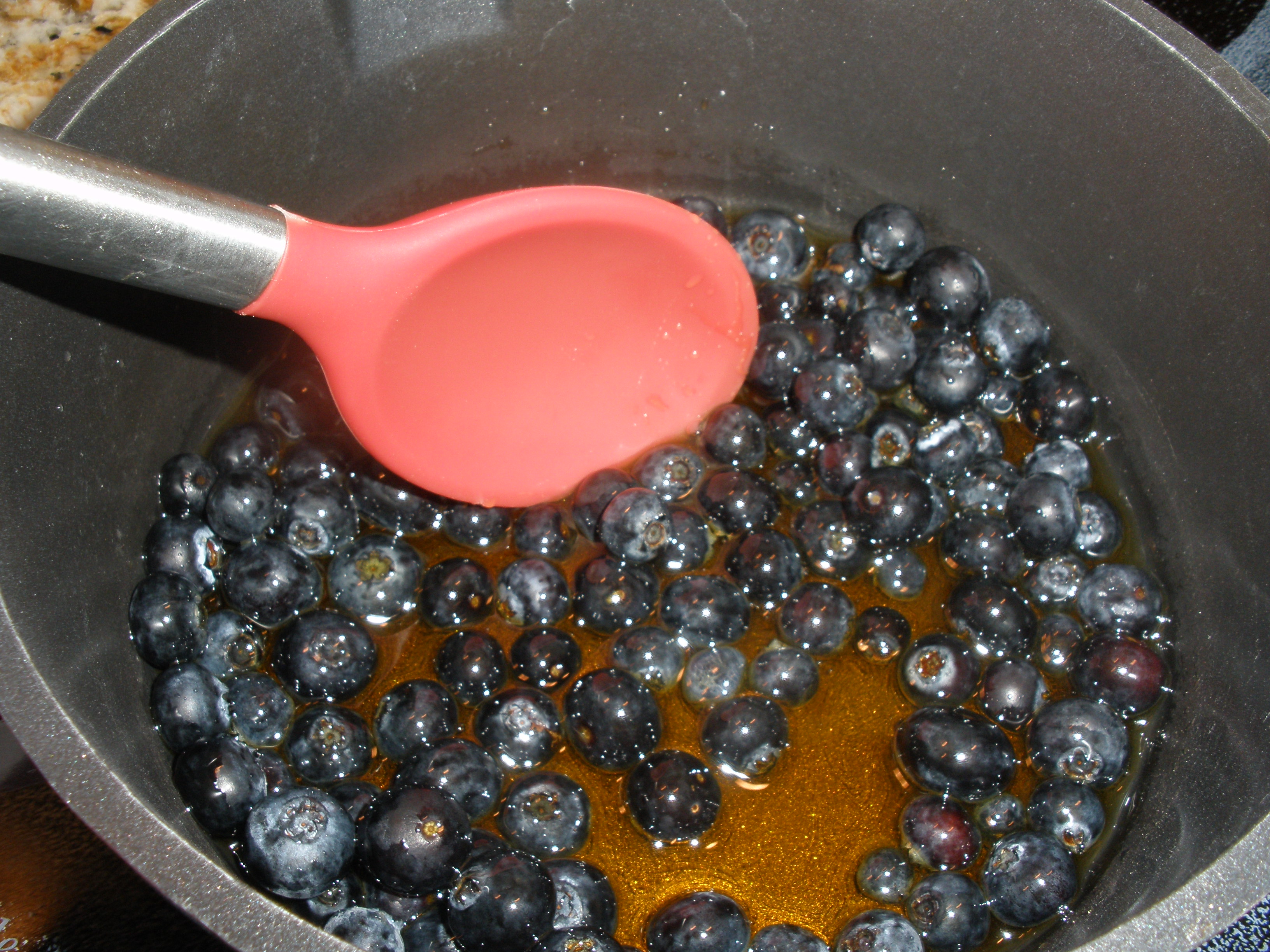 Heat the blueberries in the maple syrup in a small pot over medium heat until the blueberries start to pop, stir often. Serve warm over pancakes with a touch of butter and a sprinkle of powder sugar.