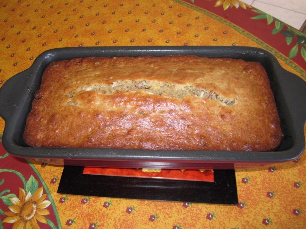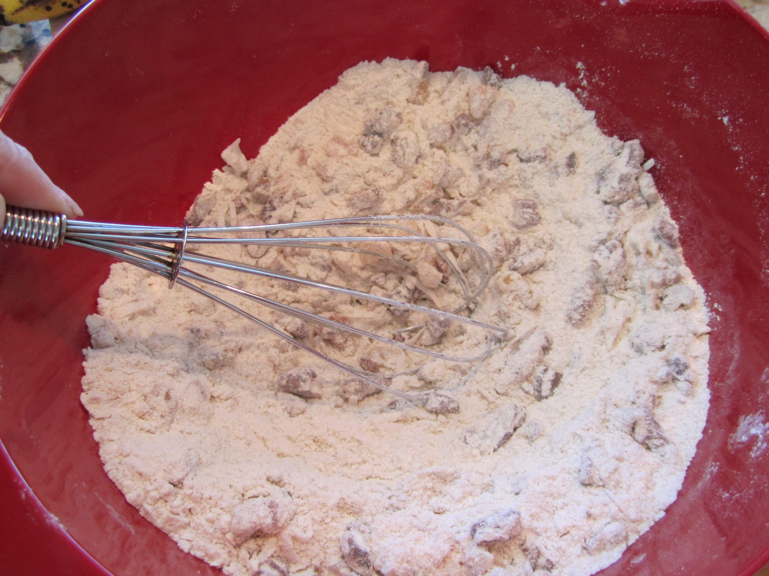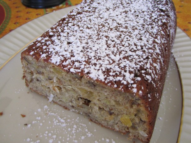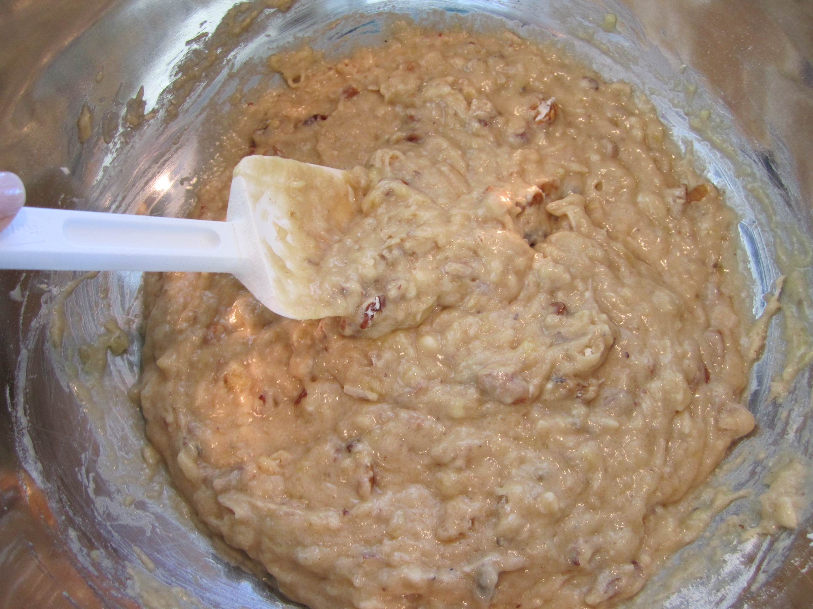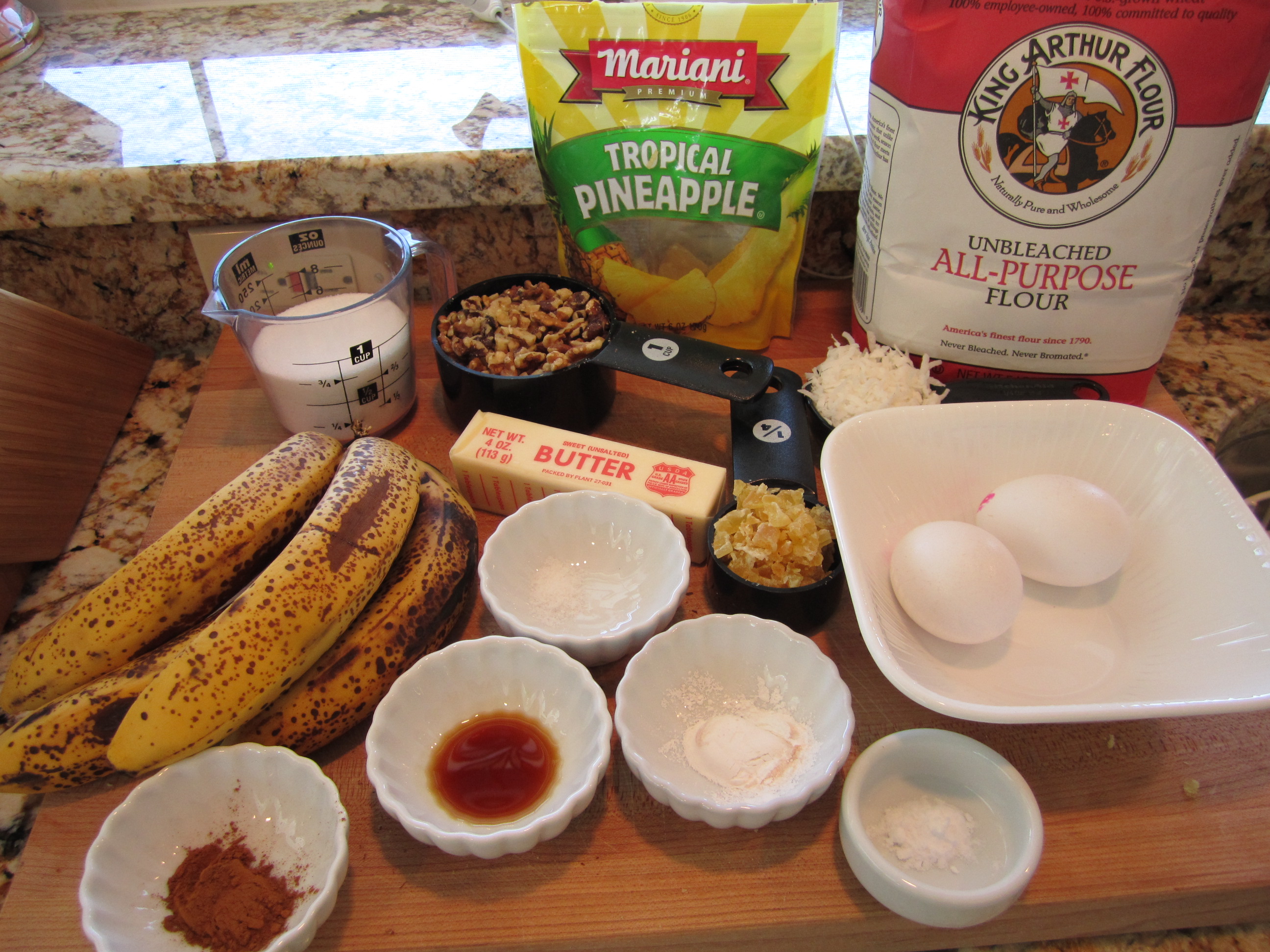 Preheat oven to 350 degrees, spray 9 x 5 x 3 inch loaf pan with flour/spray.  Set aside.  In large bowl combine flour, sugar, baking powder, baking soda, salt, cinnamon, nuts, coconut, and pineapple.  Set aside.