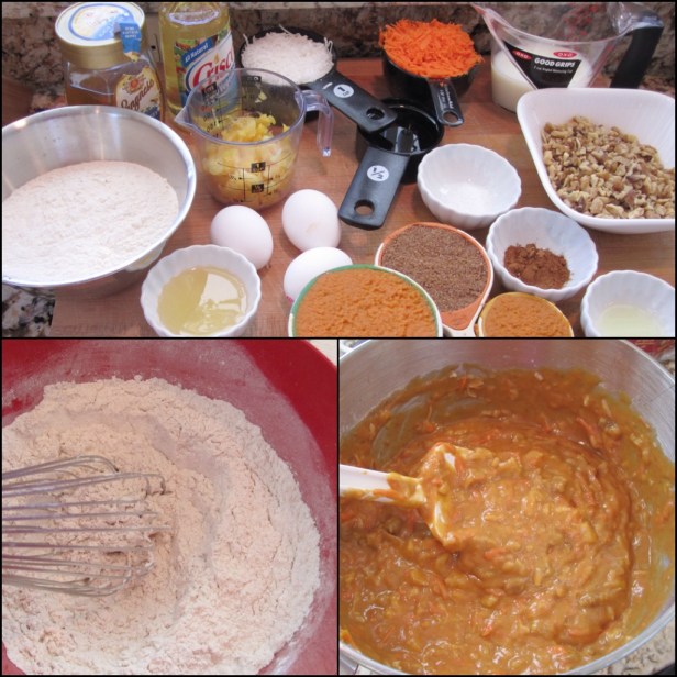 Beat eggs for a minute in your electric mixer, add pumpkin, sugar, brown sugar, honey, oil, pineapple, carrots and milk & lemon mixture and mix well with the mixer on low. Gradually add flour mixture, about a scoop at a time, beat until combined. Stir in coconut and 1 C of nuts (reserve other 1/2 C for toppings). Pour into prepared cake pans.