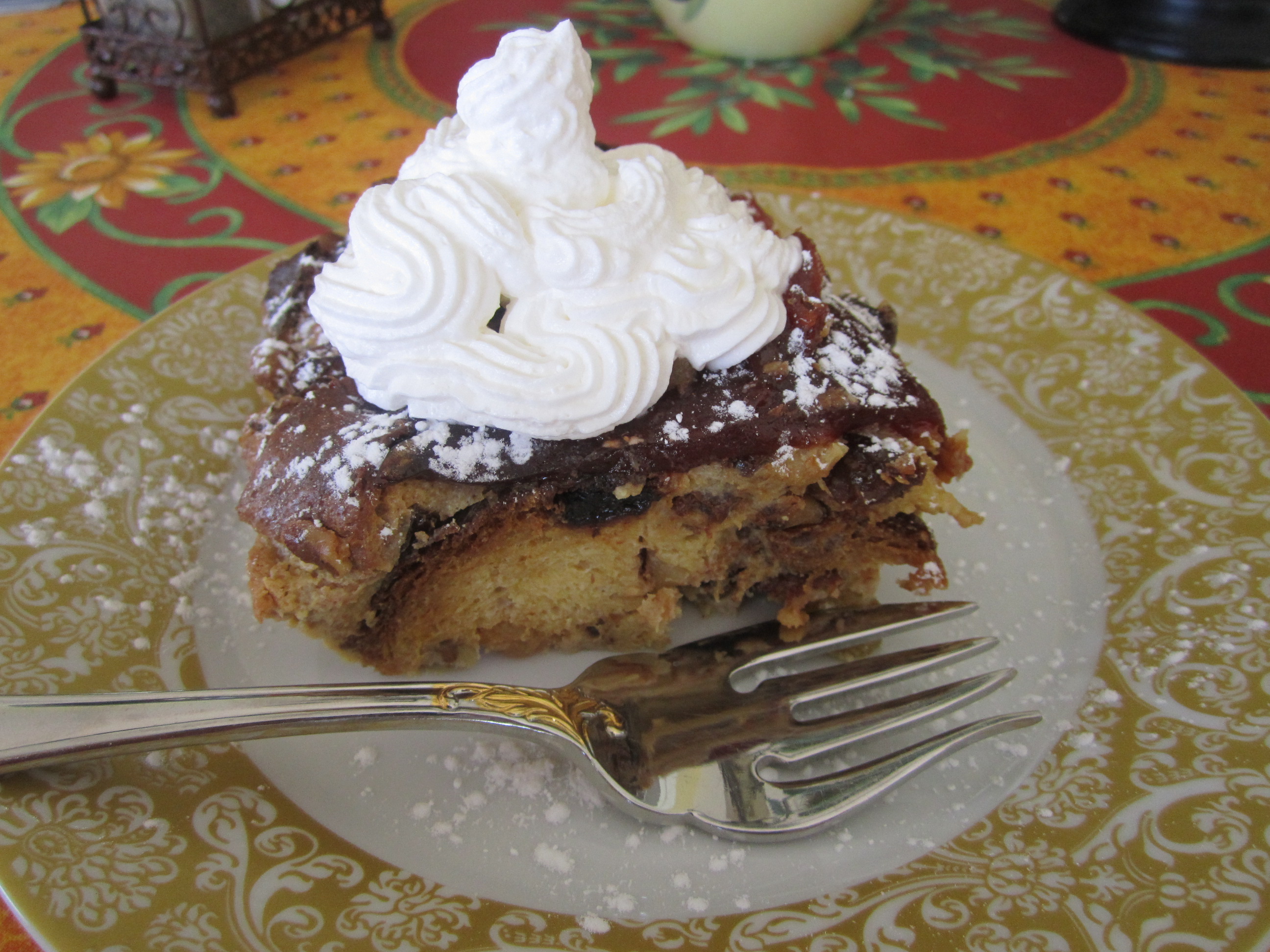 Place the baking dish into a larger pan and add very hot tap water the the larger pan until it’s halfway up the sides of the baking dish. Bake the bread pudding for 1 hour. Let cool slightly, serve with whipped cream, and a sprinkle of powder sugar. This is also delicious, cold.