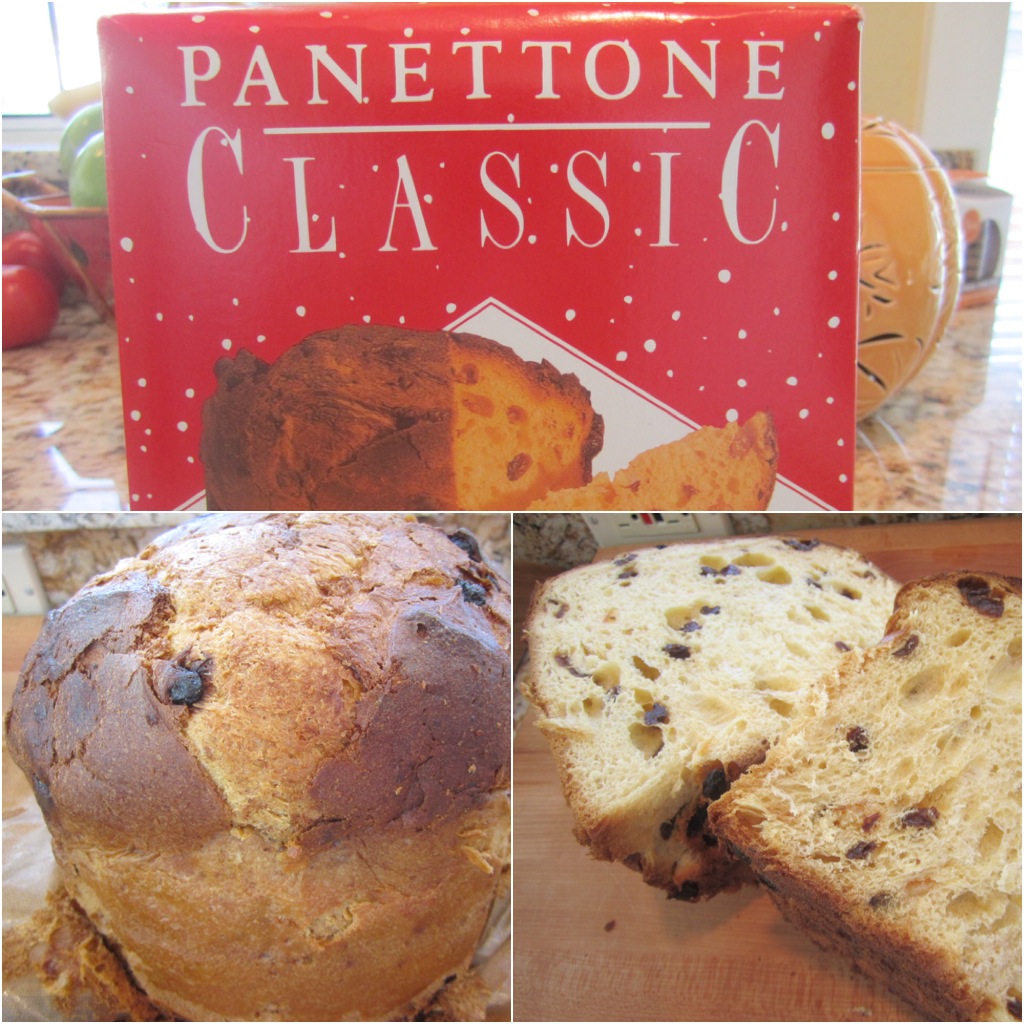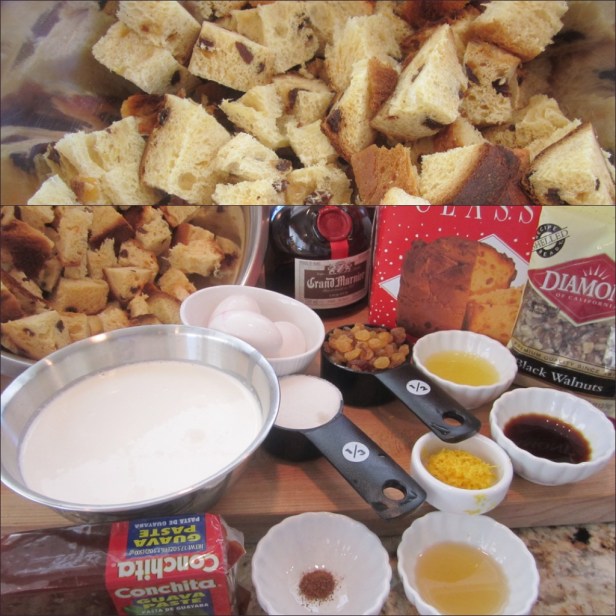 Preheat oven to 350 degrees. Grease a 9 by 12 inch glass pan with butter. Trim any dark brown outer crust from the panettone and cut the rest of the loaf into 1 inch pieces. Place in a large bowl. In a smaller bowl, whisk the eggs, then add the heavy cream, half and half, Grand Marnier, vanilla, sugar, nutmeg, orange zest, and orange juice, whisk again.