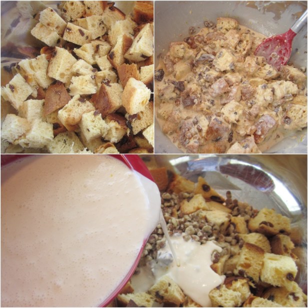 Add the egg/cream mixture into the large bowl over the panettone. Add the golden raisins and walnuts, stir with a wooden spoon, and mix gently until liquid is absorbed. Spool the mixture into the greased baking dish.