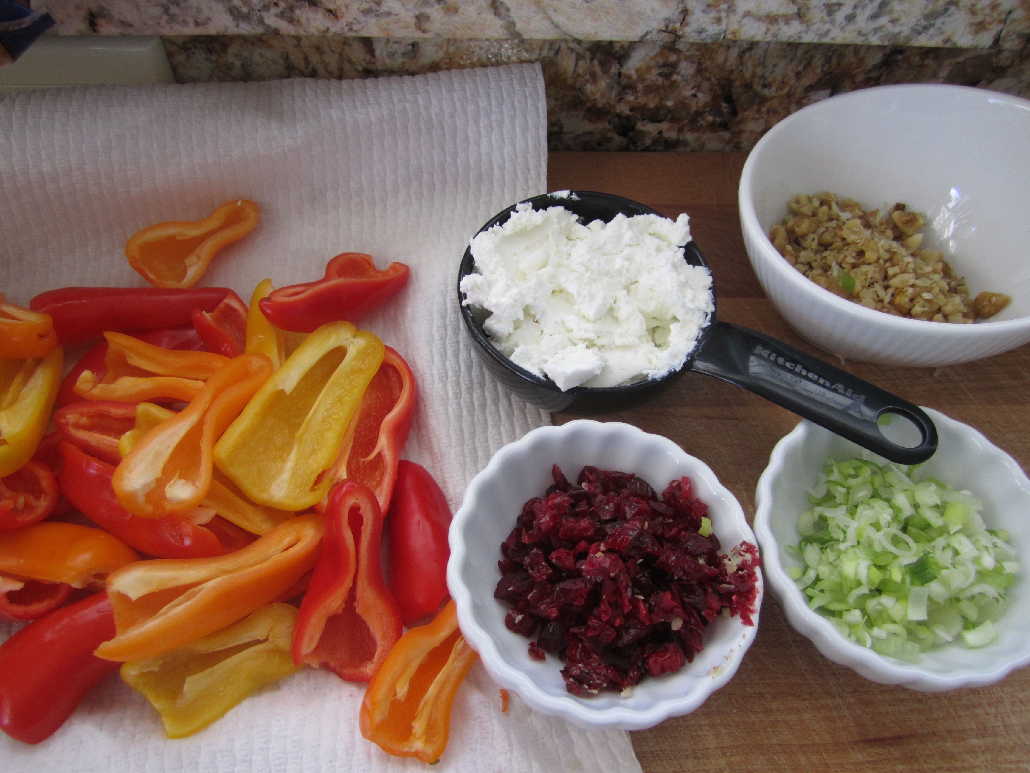 Bring goat cheese to room temperature. Finely chop cranberries and walnuts; slice green onions. Stir all three ingredients into cheese until well blended. Cut peppers in half lengthwise; remove seeds and caps. Fill peppers with cheese mixture and arrange on serving platter. Keep chilled until ready to serve. (If you have extra mini-peppers, store in plastic bag in refrigerator for other use).