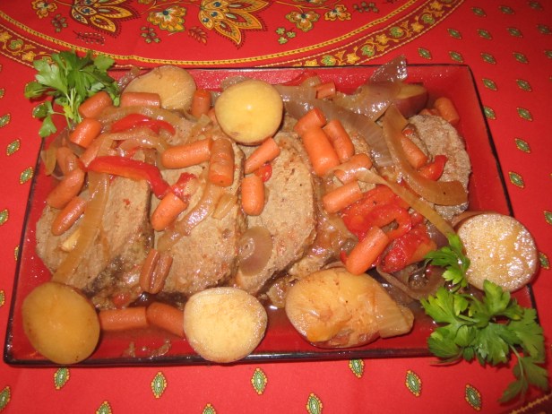 Trim off visible fat from rump roast. Salt and pepper all sides of the roast. Place flour in bowl and add some salt and pepper to flour. Place roast in flour and coat evenly. In large frying pan, heat oil on high and sear roast on all sides. After seared, place roast in slow cooker. Add sliced onion, bell pepper, carrots and potatoes on top and around roast. Add Worcestershire sauce, wine and tomato paste. Sprinkle salt and pepper on top, stir slightly. Close lid and cook on slow for 8 hours. (Serves 6)