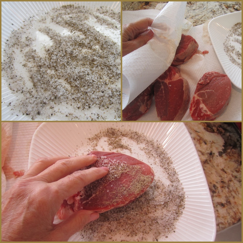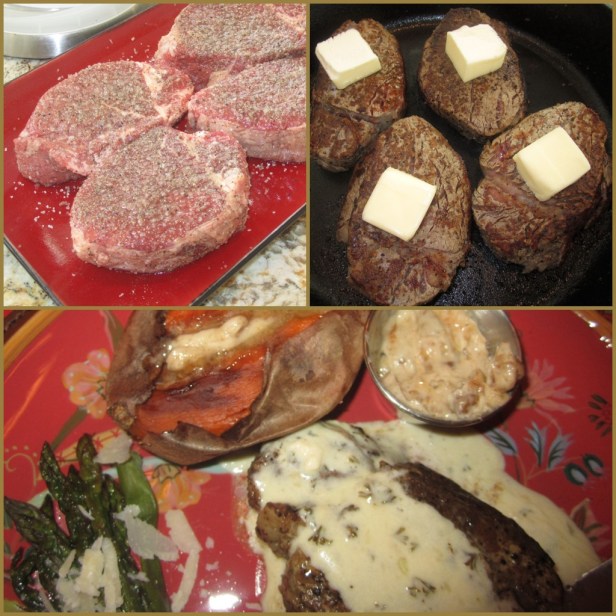 Remove the steaks to a serving platter, cover tightly with aluminum foil and allow to rest at room temperature for 10 minutes. Serve hot with Blue Cheese Sauce. Serves 4. Note: Can also wrap filets with bacon and secure with a toothpick.
