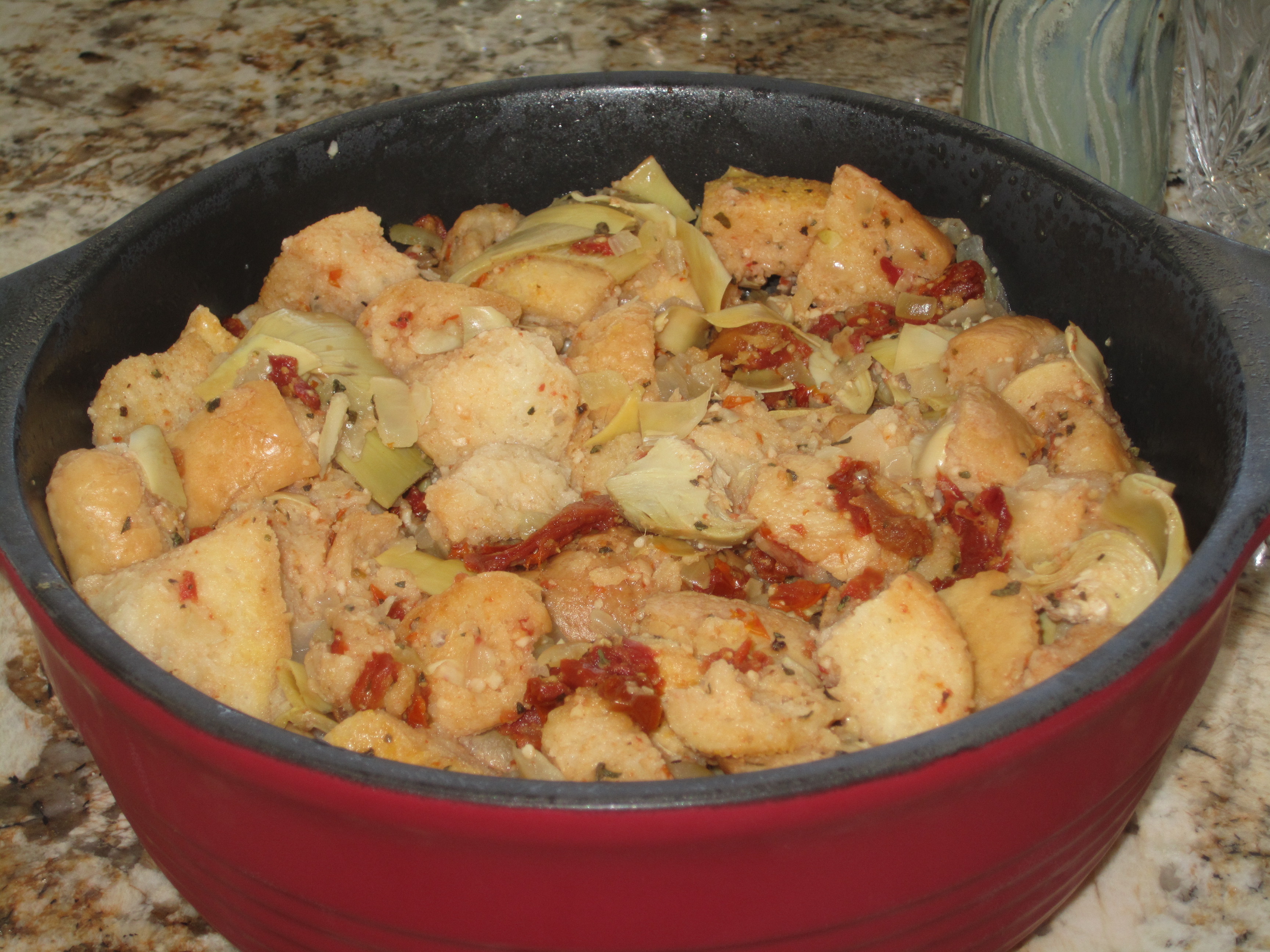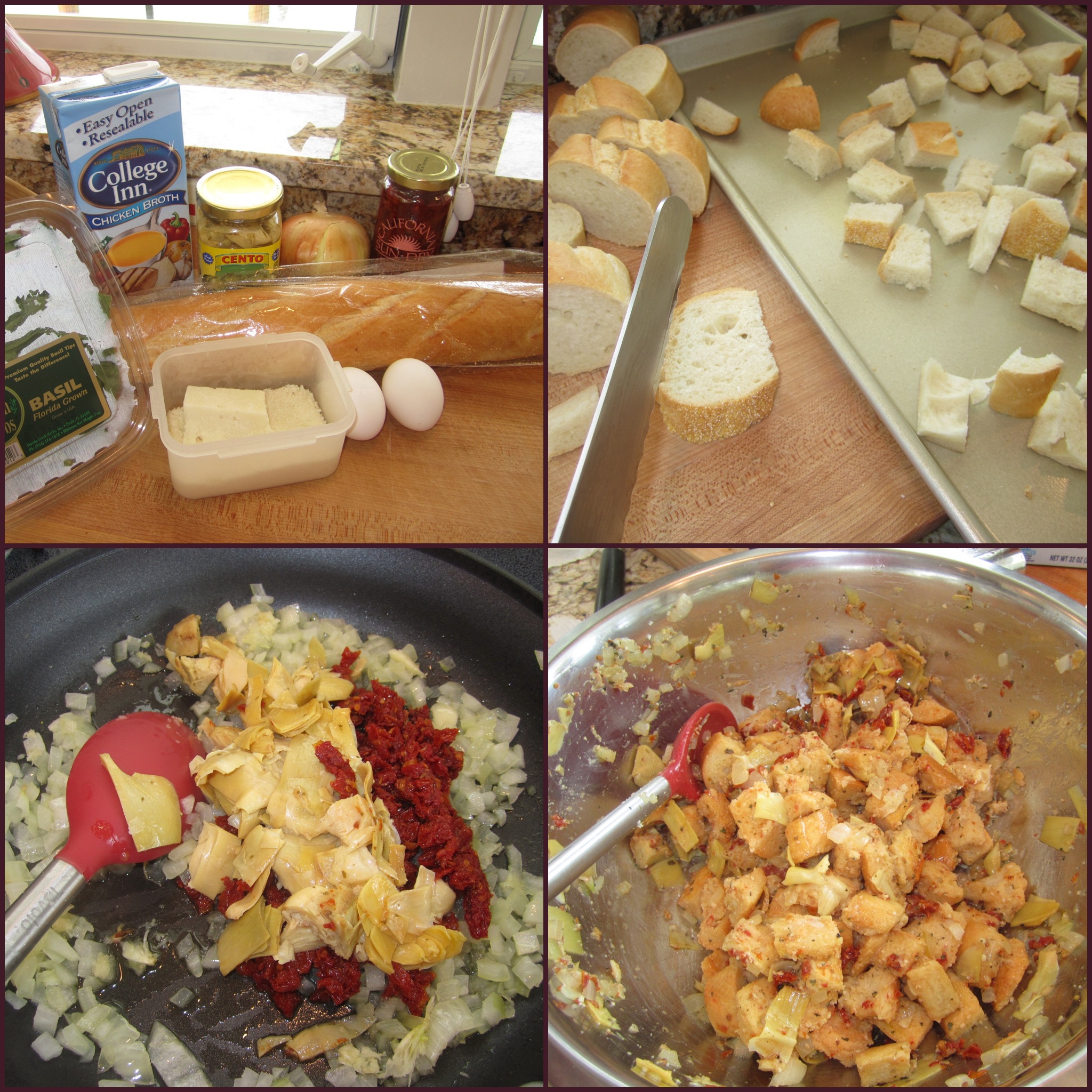 Preheat oven to 350 degrees. Toast sourdough bread for 10 minutes, set aside. Saute onion in olive oil for about 5 minutes, add garlic and saute for 1 min. more. Add artichoke hearts and sun-dried tomatoes, mix well.