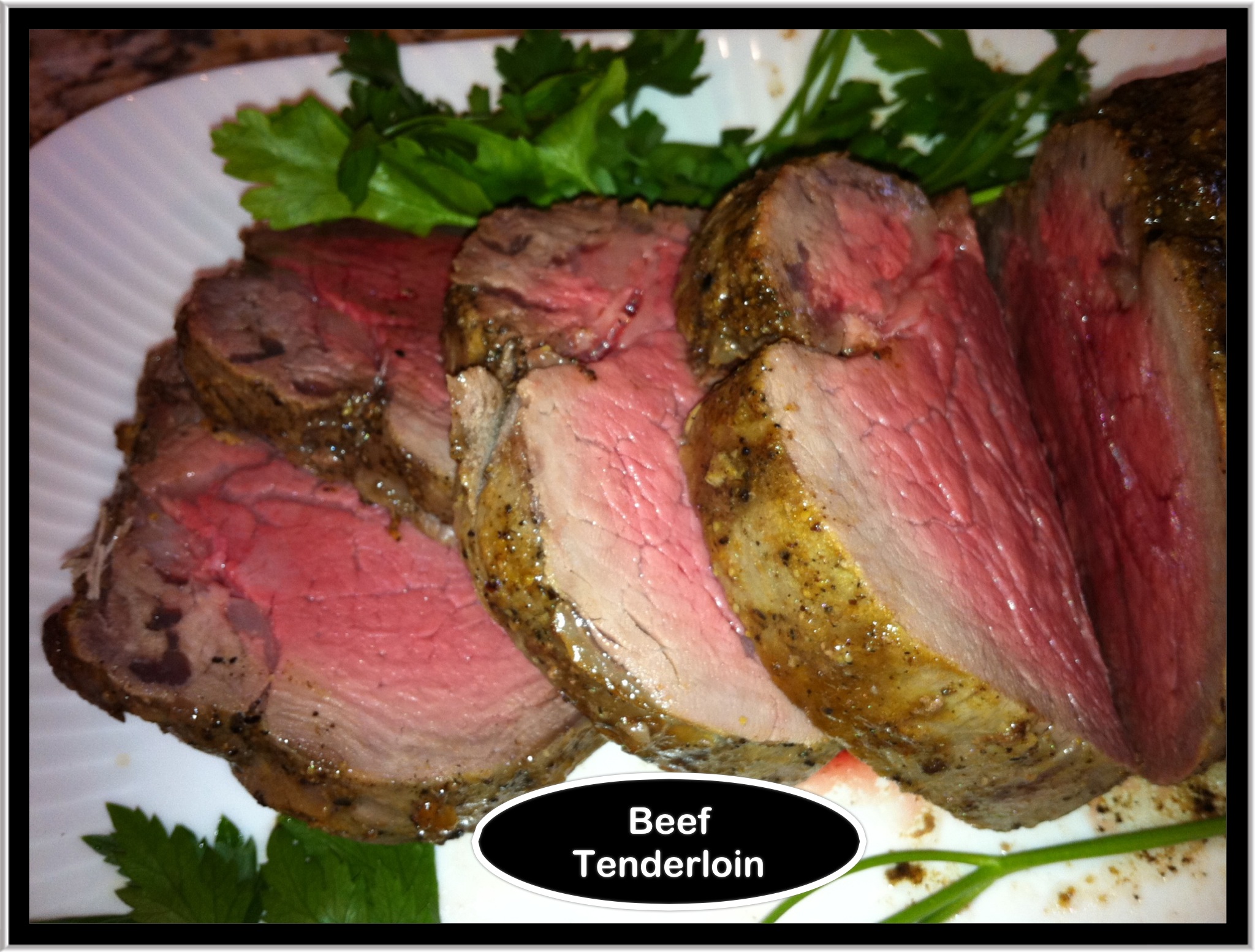 - 1 whole beef tenderloin (approx. 4 to 5 lbs.) trimmed of excess fat and tied (you can get the butcher to do this!). Bring to room temperature 1 hour before placing in oven. Note: You can have the butcher cut a whole beef tenderloin in half for a smaller dinner, freeze the other section.