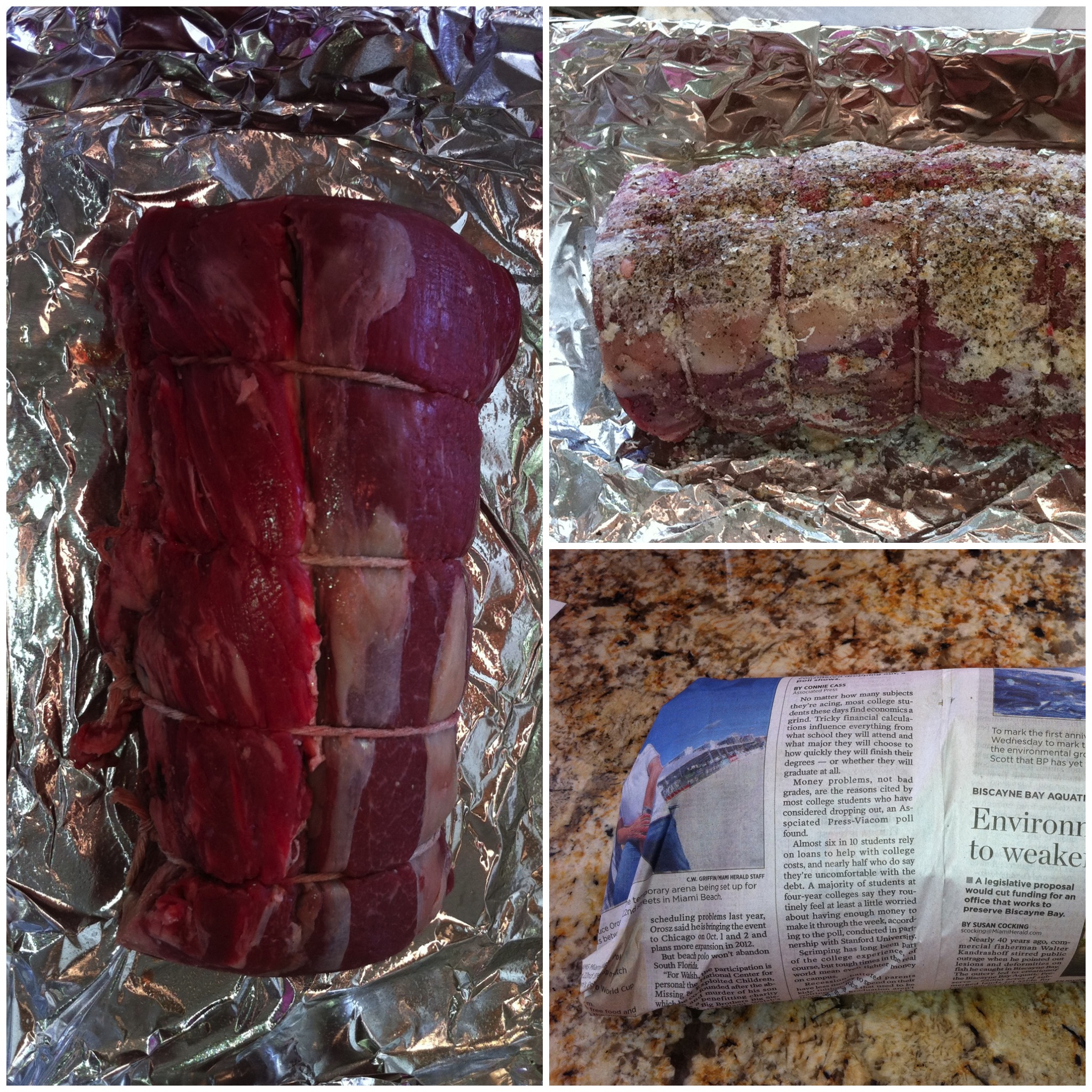 Remove the beef from the oven, cover it tightly with aluminum foil (try and seal well), roll it in newspaper and allow it to rest at room temperature for at least 20 to 30 minutes. At this point, you can unwrap it from the newspaper and foil, remove the strings and slice the filet 1 1/2 inch thick (or to your liking). Serve with Horseradish Sauce or blue cheese sauce.