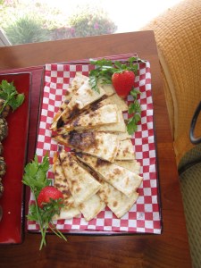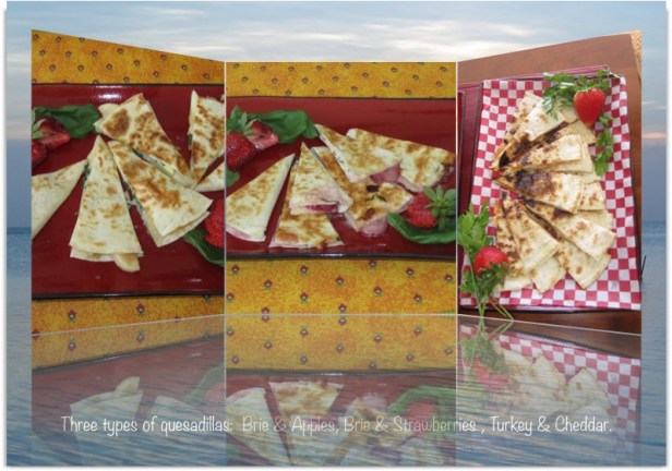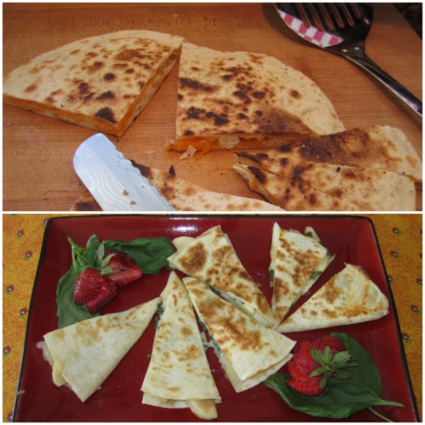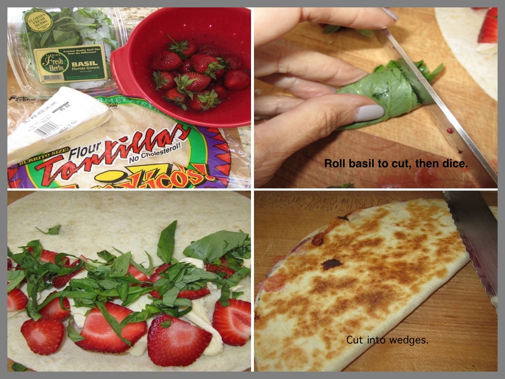 Heat a 10-12″ nonstick skillet on the stove over medium heat, spray with olive oil spray. Woking with 1 tortilla at a time, spread 1 ounce of brie chunks over half of it. Top with 2 sliced strawberry, spreading out and 1 T of chopped fresh basil. Fold over and place in the hot pan, spray the top of the tortilla with olive oil spray, sprinkle slightly with salt and pepper.