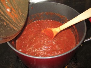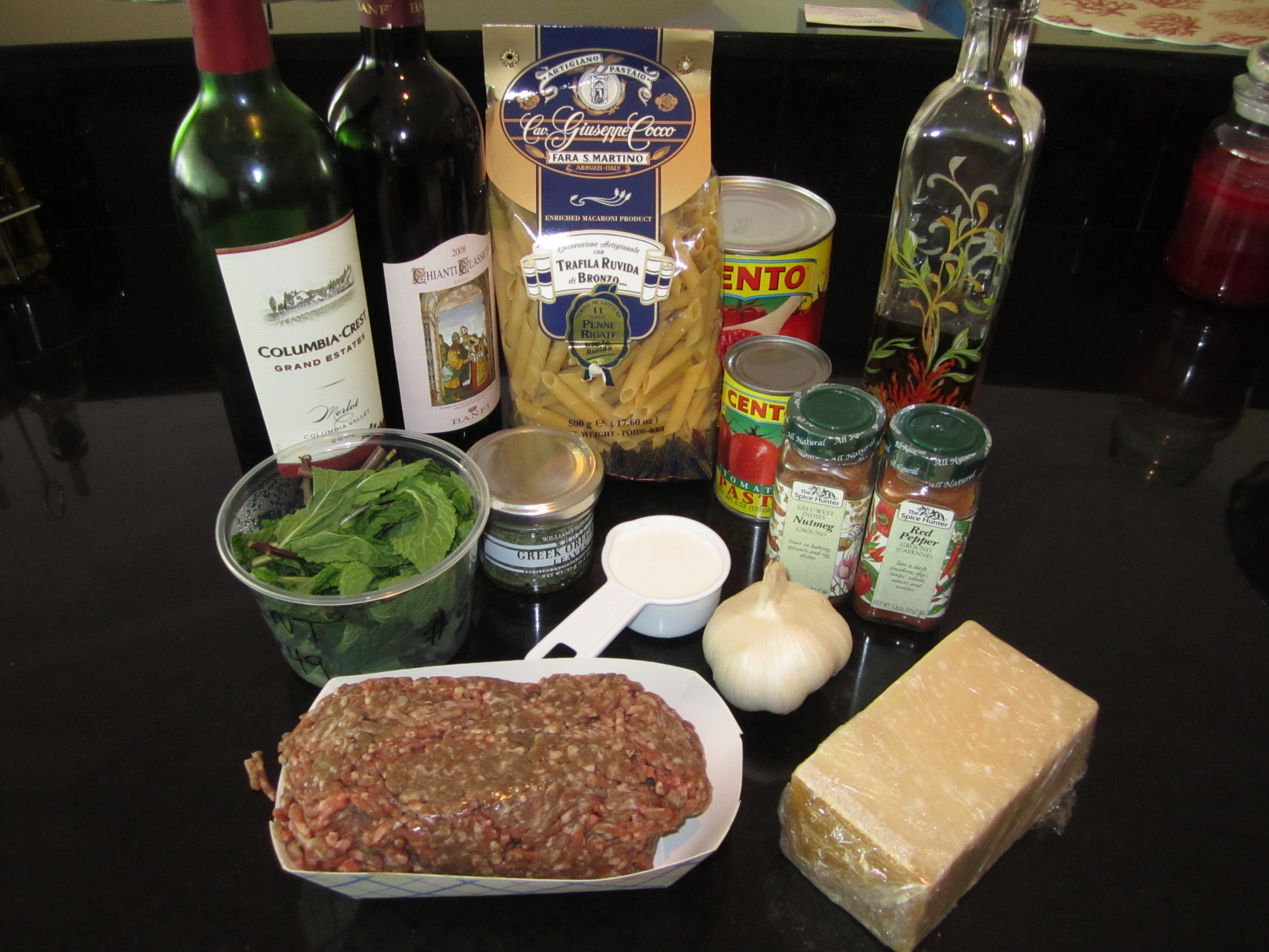 Place 2 T olive oil in large frying pan, on medium-high heat. Brown the ground sirloin and break up with wooden spoon. Add crushed garlic, oregano, hot pepper, Chianti, crushed tomatoes, tomato paste, salt and pepper. Stir well and simmer about 10 minutes.