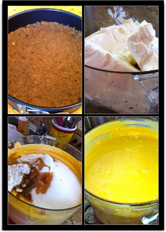 Place cream cheese in food processor or bowl. Either process in food processor or beat with electric mixer until smooth. Add pumpkin puree, eggs, egg yolk, sour cream, sugar and the spices. Add flour and vanilla. Beat together until well combined. Pour into crust. Spread out evenly and place in oven for 1 hour.