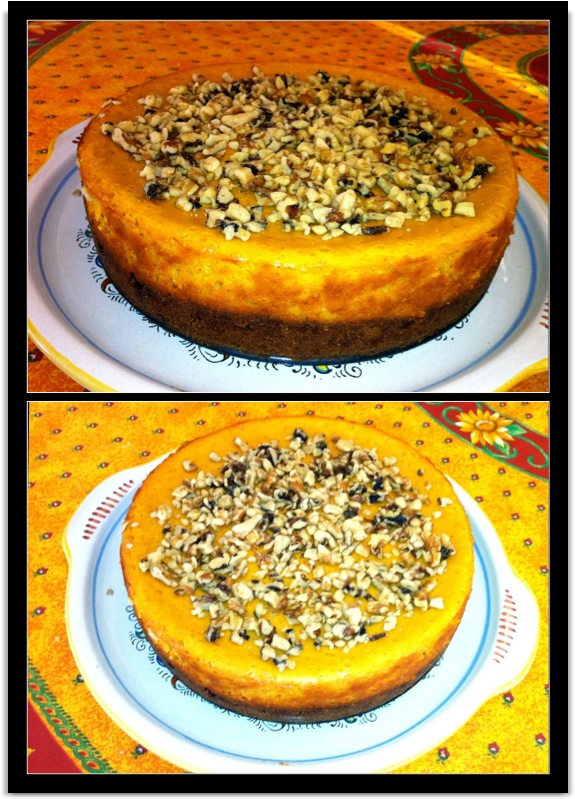 Remove from the oven, run a knife around the edges to loosen it from the sides (this will help with cracking of the top). Sprinkle the walnuts evenly over the top and let sit for 15 minutes. Cover with plastic wrap and refrigerate for 4 hours. Do not take the springform pan off until it has been refrigerated. Leave the bottom pan on. Now you can wrap it well and freeze it or serve it with a dollop of whipped cream.