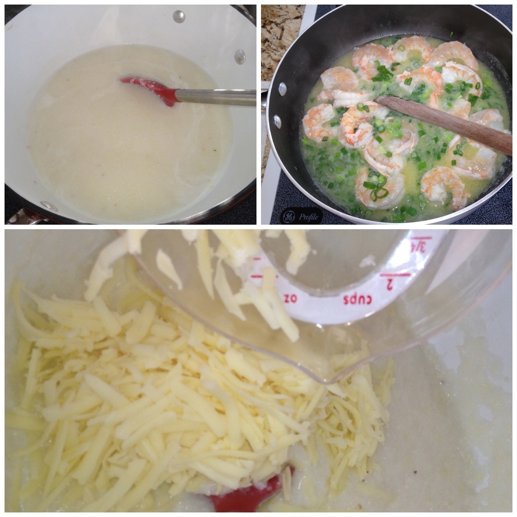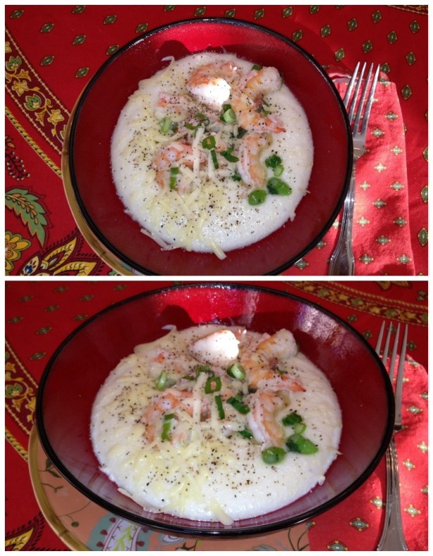 Spoon cheese grits into 4 bowls, top with shrimp mixture, sprinkle with cracked pepper & a little salt; garnish with cheese and a few green onion slices. Makes 4 servings.