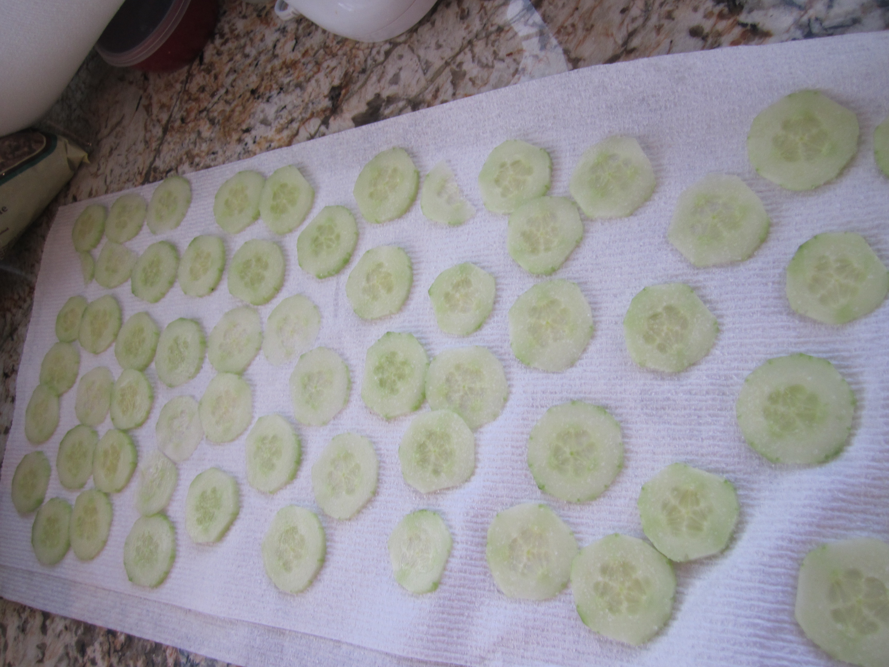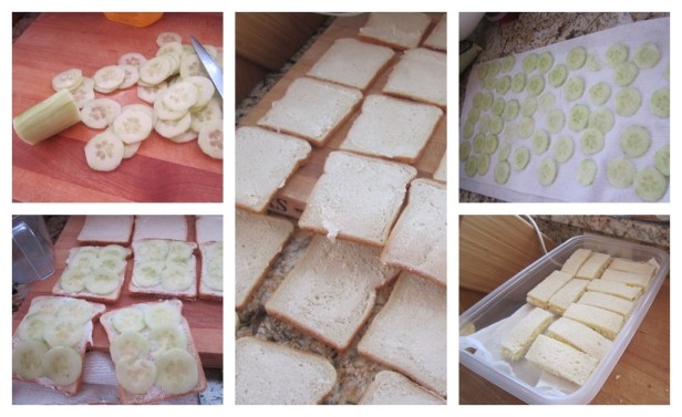 side of each piece of bread with a thin layer of butter then with a layer of the cream cheese mixture (the butter will keep the bread from getting soggy.) Top one of the slices with the cucumber slices, all slightly overlapping and top with the other piece of bread. Cut the crusts off using a gentle sawing motion with a bread knife. Cut in threes (oblong). MAKES 21 sandwiches.