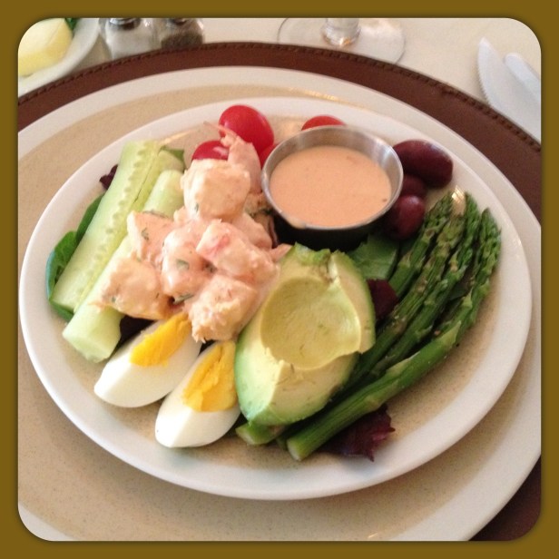 Use 4 salad plates and 4 small containers to hold the dressing. Place the container on the plate and fill each container with the Louie dressing in order for each person to pour the amount they want on their salad. Fill the plate with the lettuce. Arrange the cherry tomatoes, olives, asparagus, cucumbers, and eggs around the edges of the plate, leave room the the center for the shrimp. At this point, you can cover the dishes with plastic wrap and refrigerate for later use, if not serving immediately. Do not peel the avocado and place it on the plate until the last minute and right before serving or it will turn brown.