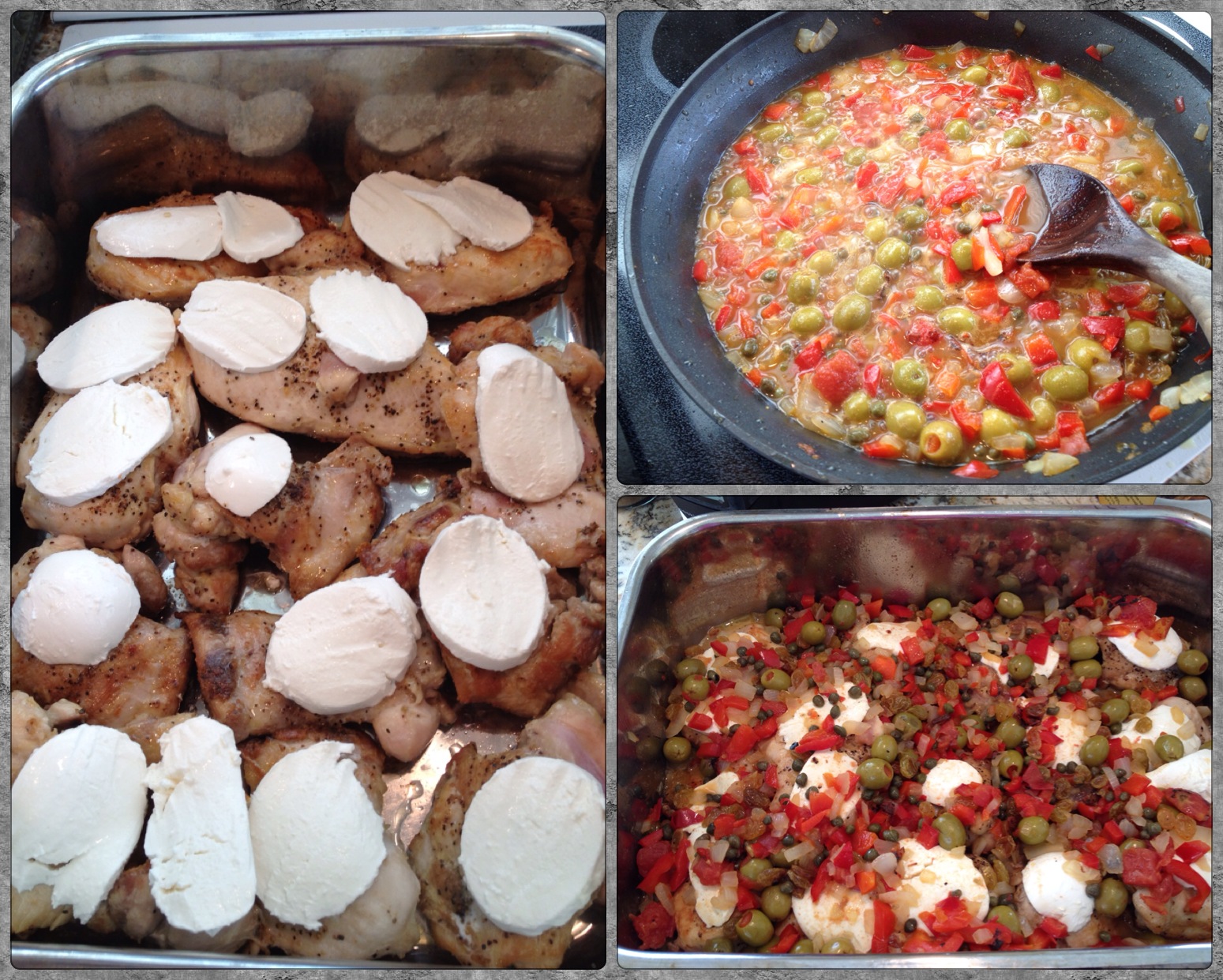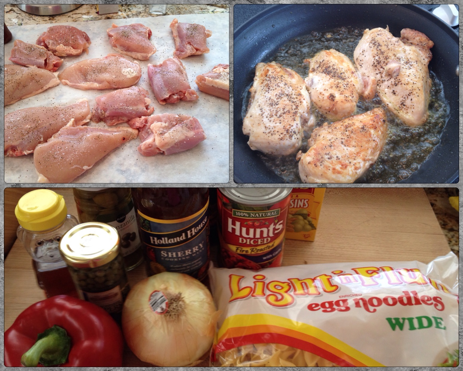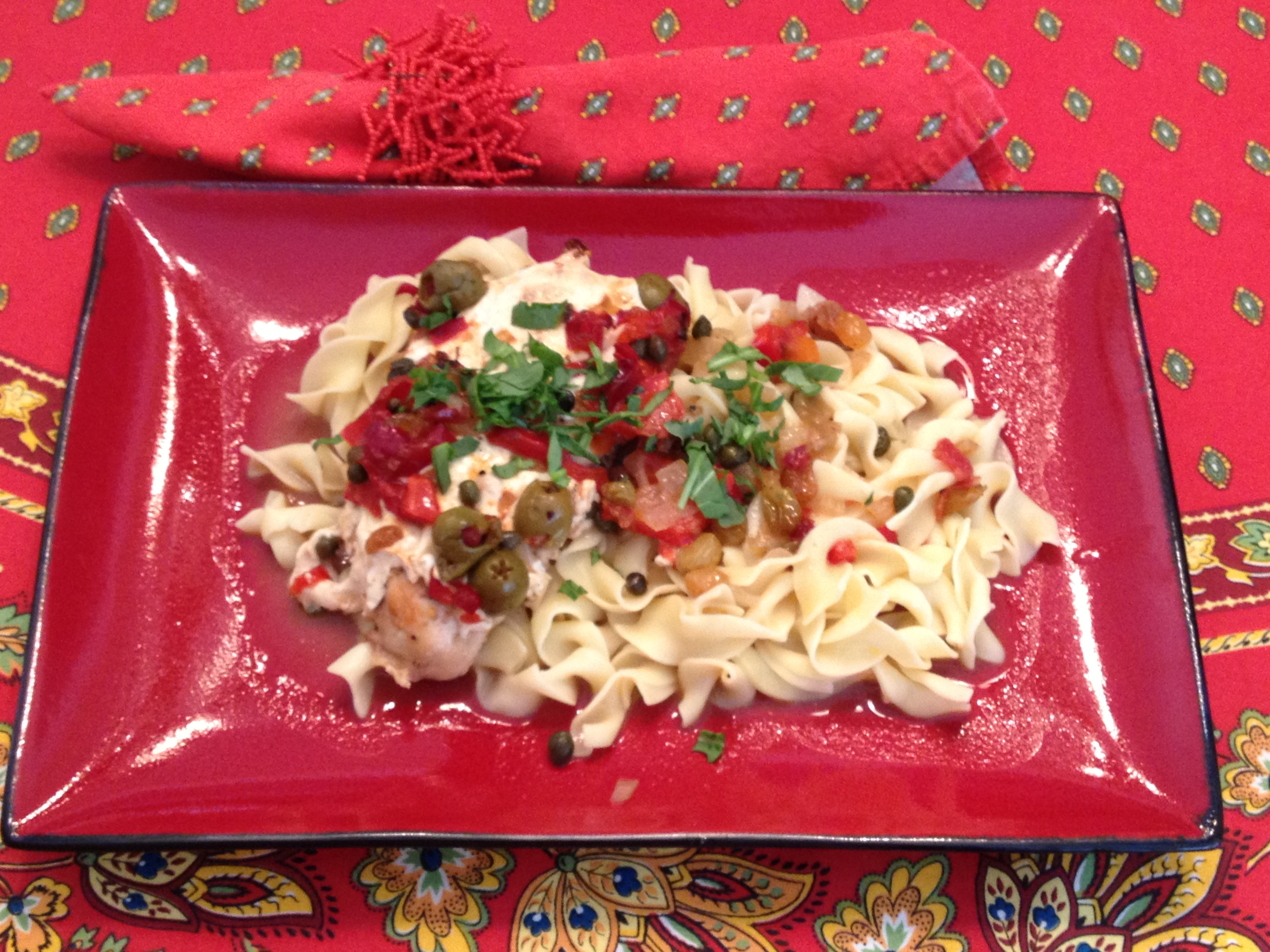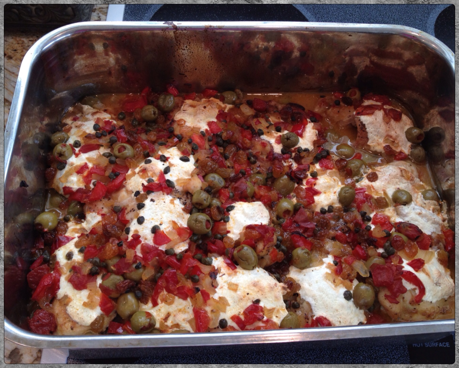 When finished frying all the chicken, discard most of the oil, leaving a couple of teaspoon in the pan. Add the chopped onions and bell peppers to the frying pan and sauté for approx. 3 minutes. Add capers, olives, raisins, honey, can tomatoes with some juice, and sherry cooking wine. Simmer all together for 3 minutes. Pour all the ingredients and liquid over the chicken and mozzarella. Bake uncovered for 1 hour. Serve with cooked noodles, placing the chicken around it. This is a great dish to serve “family style”. Serves 6 to 8 people, freezes well.