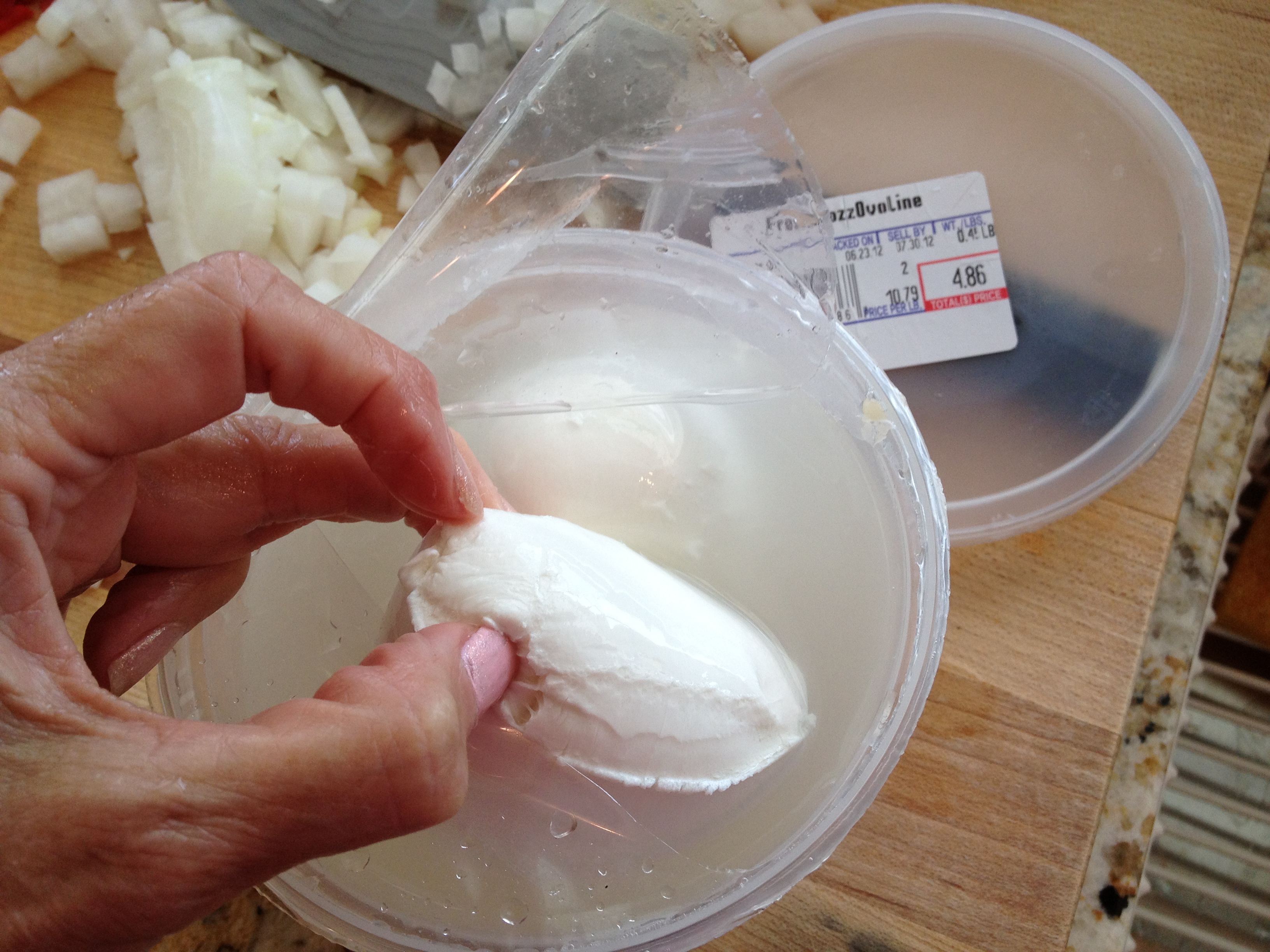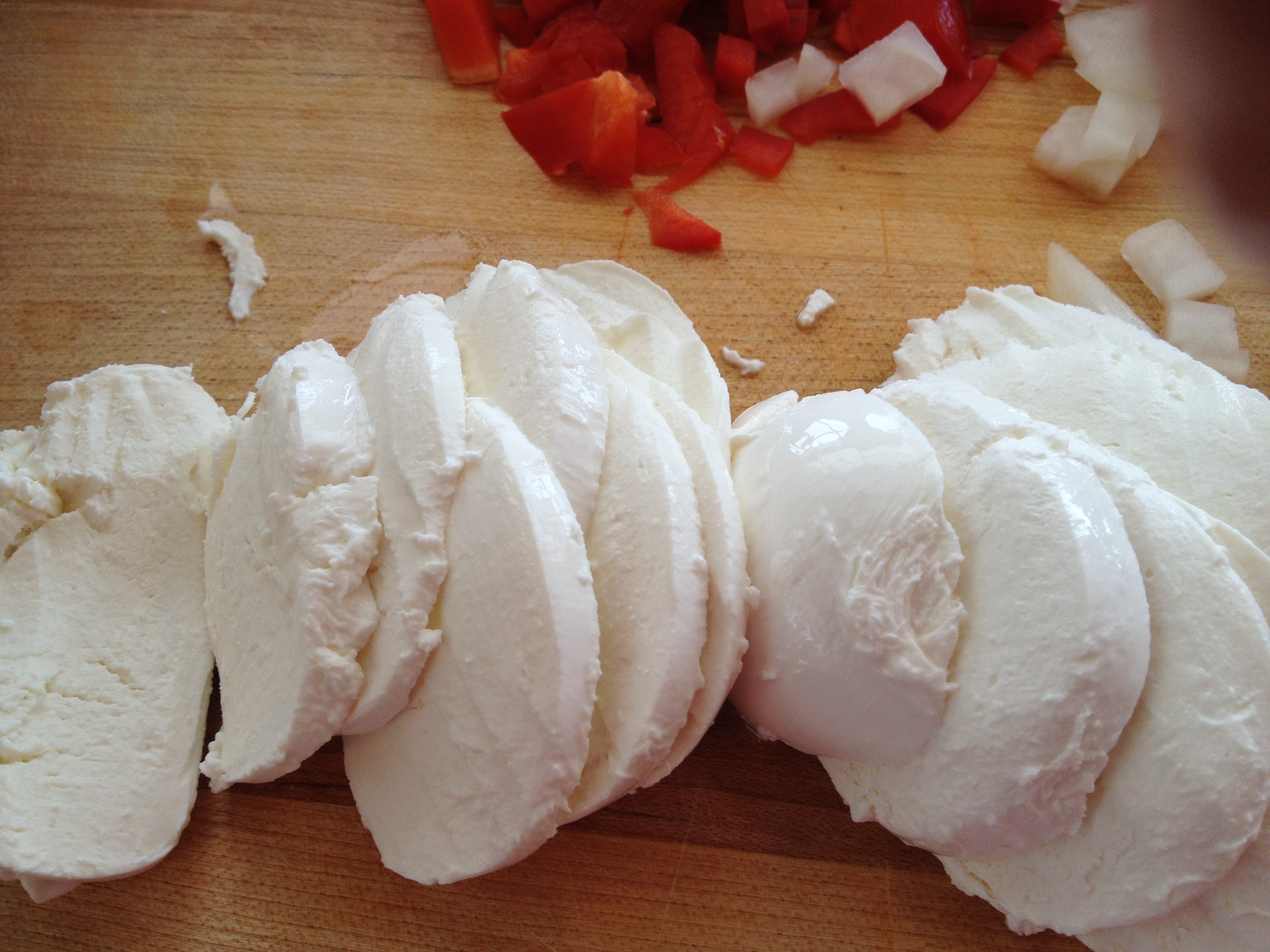 Preheat oven to 350 degrees. Set aside large baking pan. Place large frying pan on stove on medium-high and place 1 cup olive oil in pan. Salt & pepper each side of chicken. Fry chicken in batches for approx. 3 minutes per side in order to brown slightly. Place the browned chicken in a single layer in the baking pan. Place one or two slices of mozzarella cheese on top of the chicken.